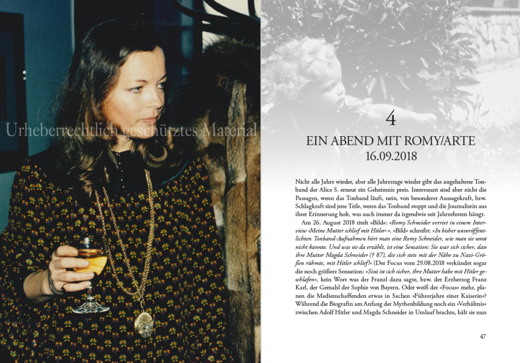 Zum 80. Geburtstag Romy Schneiders ging die Behauptung einer fantastischen Bettgeschichte ihrer Mutter Magda Schneider und Adolf Hitler quer durch die europäischen Medien. »Romy Schneider: Meine Mutter schlief mit Hitler.« (Bild) »Hitler bedded mum«, (The sun)...
