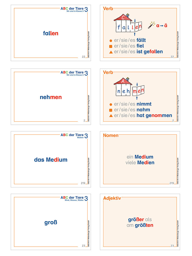 Mit den Wortkarten können die Wörter der jeweiligen Einheit geübt werden. Auf den Karten werden die Wörter noch mit dem zweifarbigen Silbentrenner dargestellt. Dabei sind im Falle von Nomen der bestimmte und unbestimmte Artikel und die Pluralbildung, im Falle...