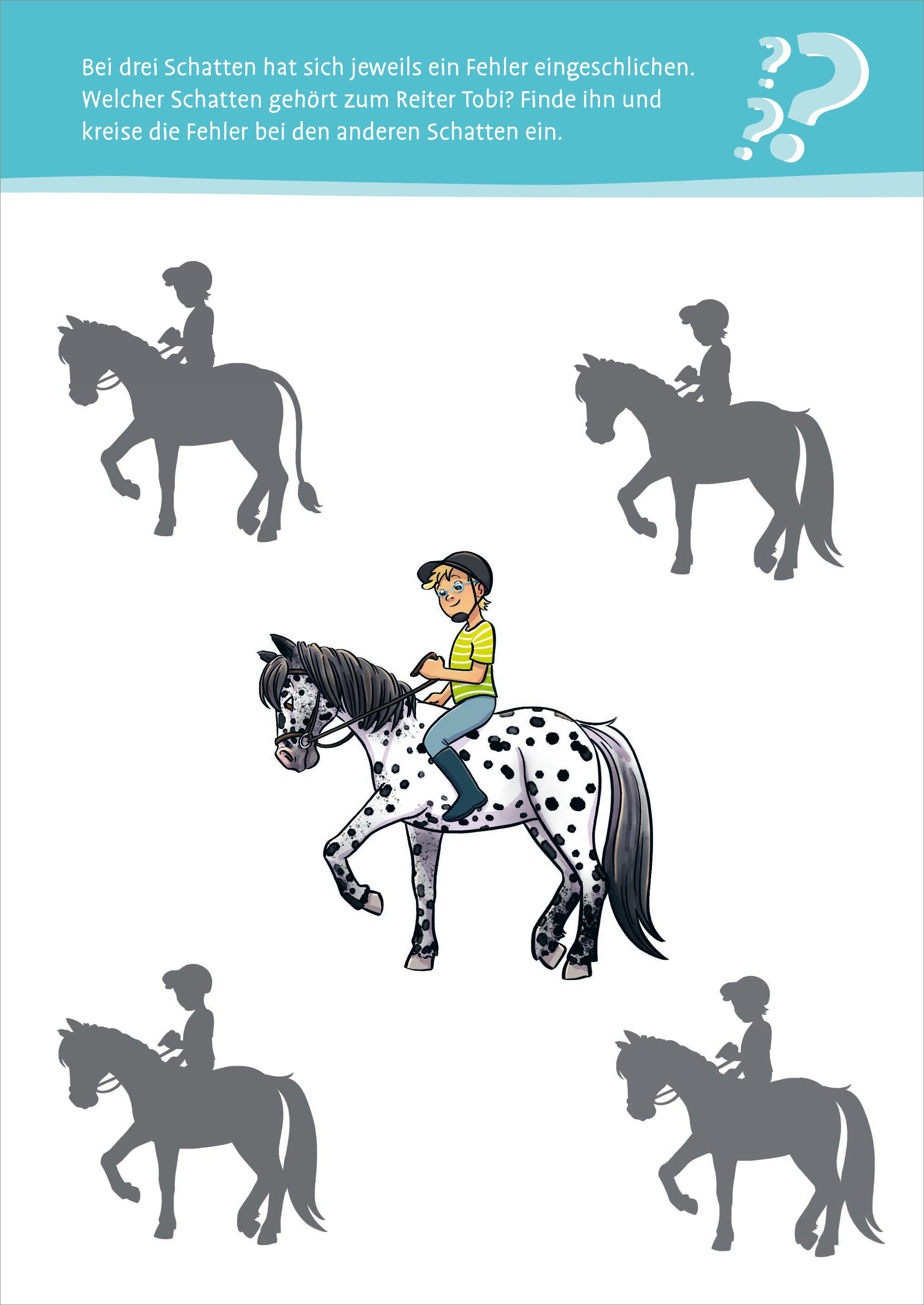 40 pferdestarke Rätsel warten darauf gelöst zu werden! Welches Fohlen gehört zu seiner Mutter? Welcher Bildausschnitt gehört zu dieser Reiterszene? Welche Gegenstände gehören nicht auf den Reiterhof? Welche Kleidung benötigst du zum reiten? Zehn verschiedene R...