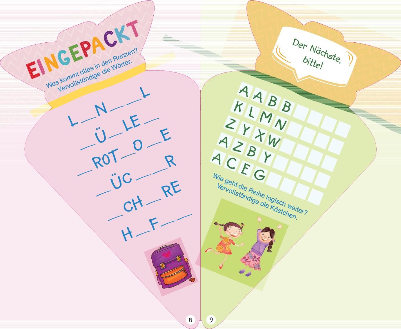 Ich bin jetzt ein Schulkind (für Mädchen). Eintragen, Rätseln, Stickern in Schultüten-Form