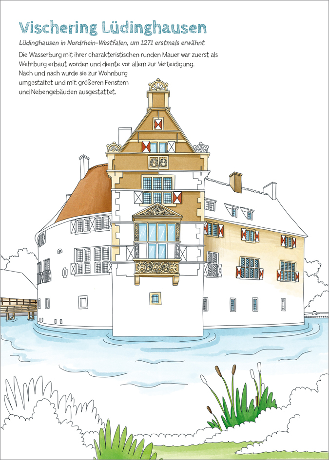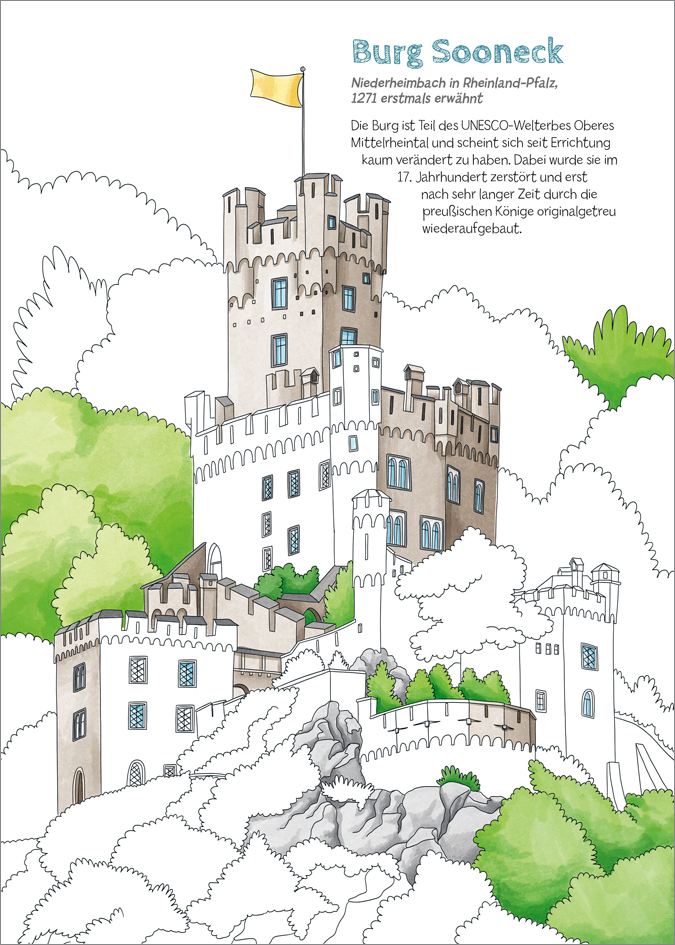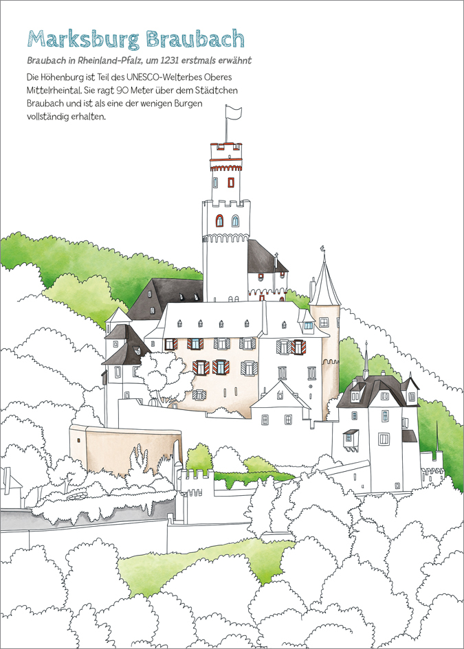 Das Malbuch beinhaltet 31 Burgen aus ganz Deutschland. Einige der Bauwerke sind Teil des UNESCO-Welterbes und bedeutende Zeitzeugen, die Geschichte lebendig werden lassen. Die außergewöhnliche Inselburg Pfalzgrafenstein im Rhein, die geschichtsträchtige Wartbu...