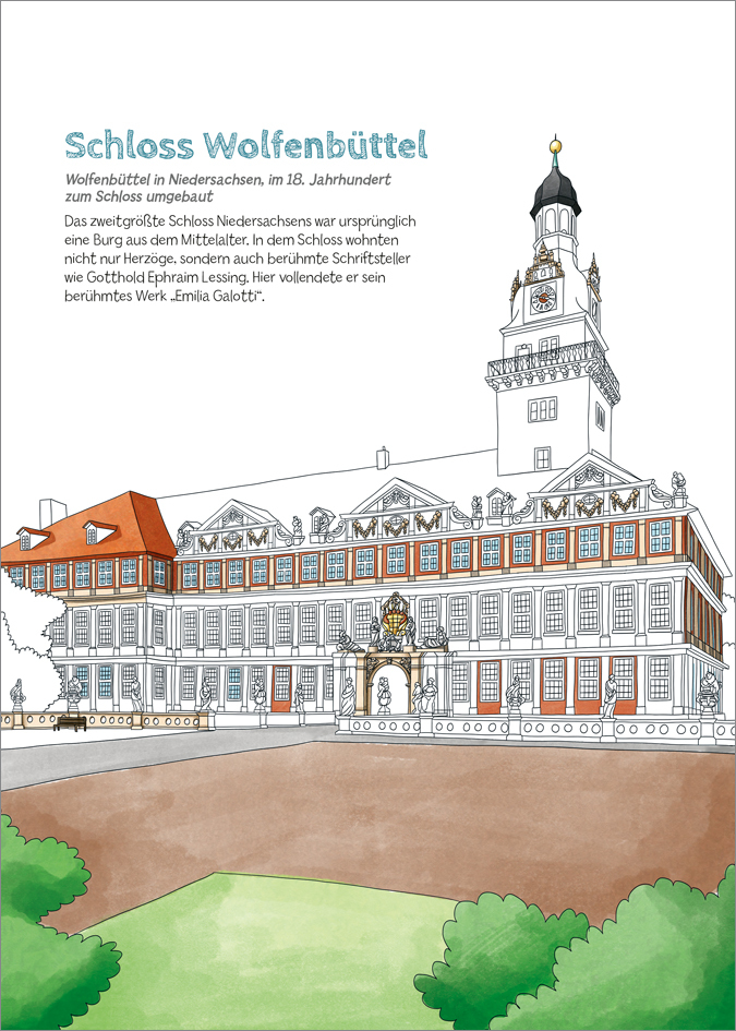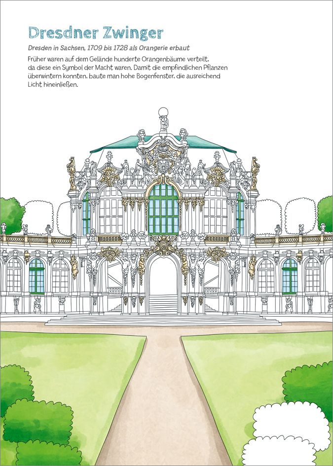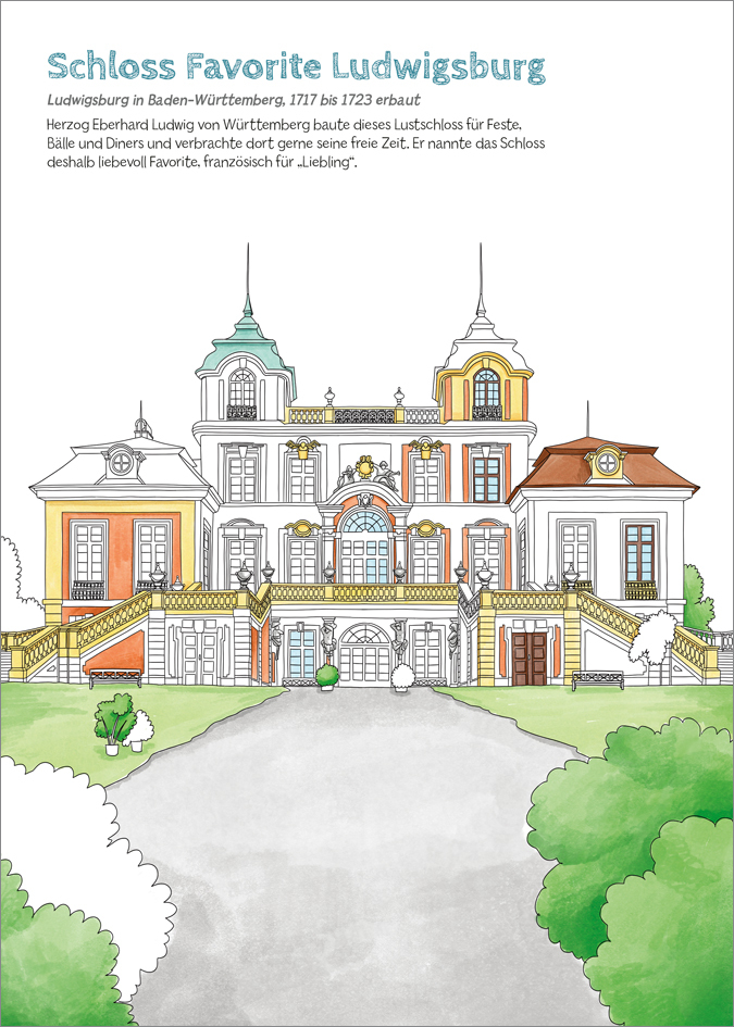 Von Schloss Albrechtsburg bis zum Zwinger in Dresden stehen einige der schönsten Schlösser Deutschlands zum Ausmalen bereit. Das größte Schloss Ludwigsburg, Schloss Sanssouci mit seinem bekannten Schlossgarten und 29 weitere Schlösser bieten Malspaß für Kinder...