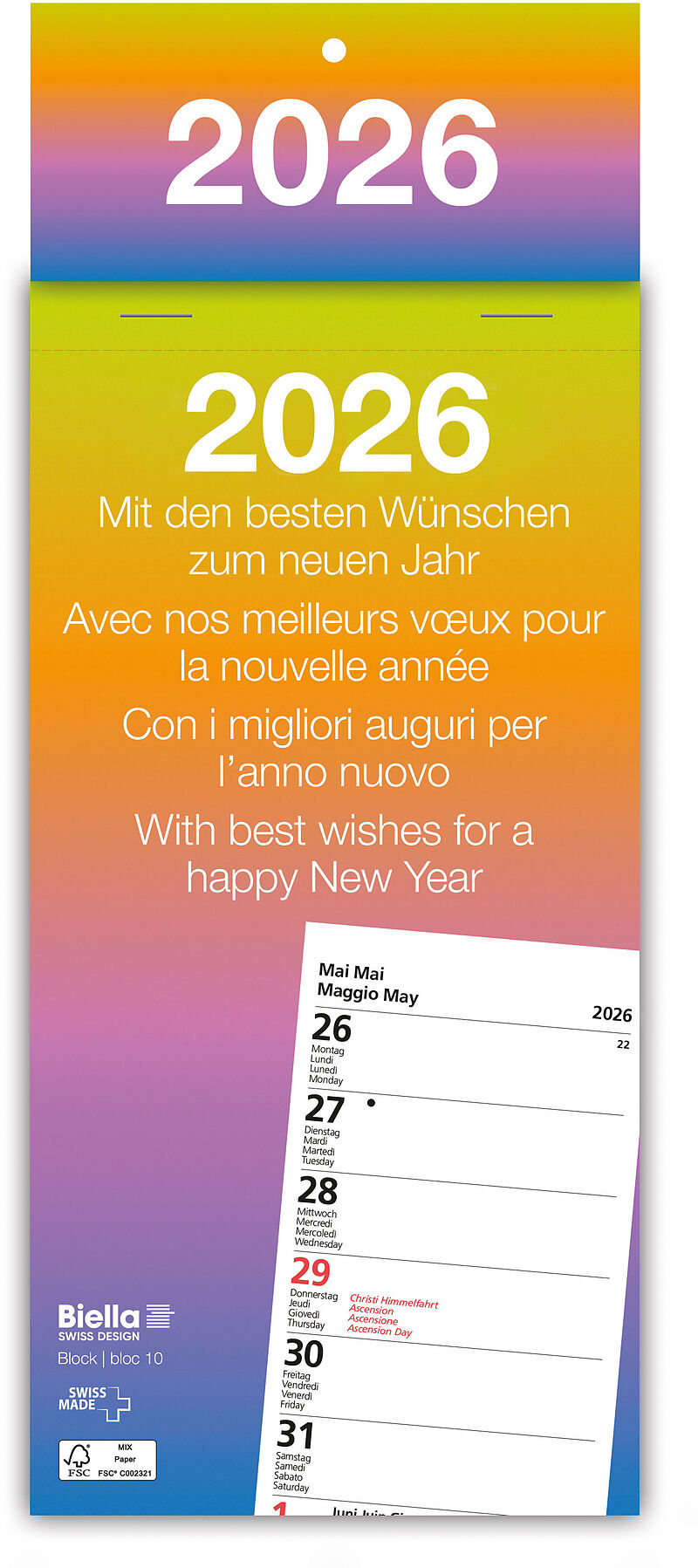 Wand-/Abreisskalender hoch Der Biella Abreissblock mit 1 Tag pro Seite, zum Aufstellen oder Aufhängen, bietet Ihnen unauffällig den täglichen Überblick. 1 Woche / 1 Seite 10.5 x 21 cm Auf- und absteigende Tagesnummerierung Sonnenauf- und untergang Namenstage ...