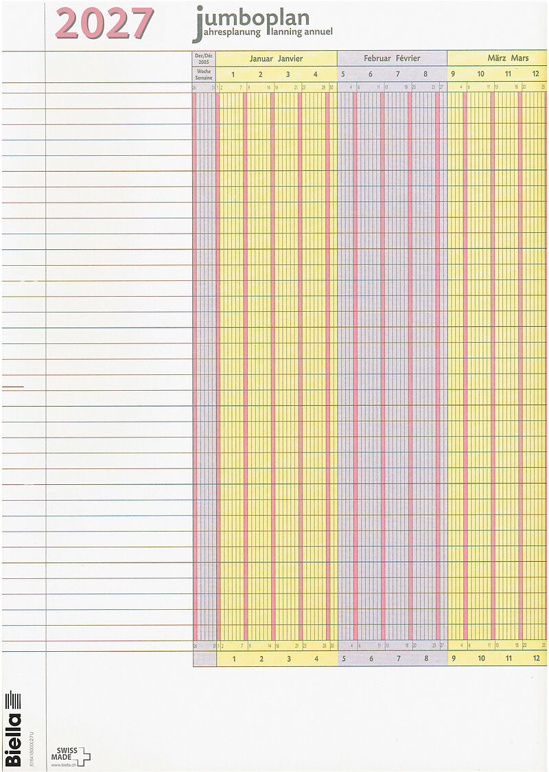 JUMBOPLAN - Jahres-Wandplaner Der Biella Halbjahresplaner bietet eine Ganzjahresübersicht. Ideal für die Personal- und Ferienplanung. 1 Jahr / 1 Seiten 64.5 x 29.7 cm Kalendarium d-f, Druck 3-farbig Wochen- und Tagesnummerierung oben und unten...