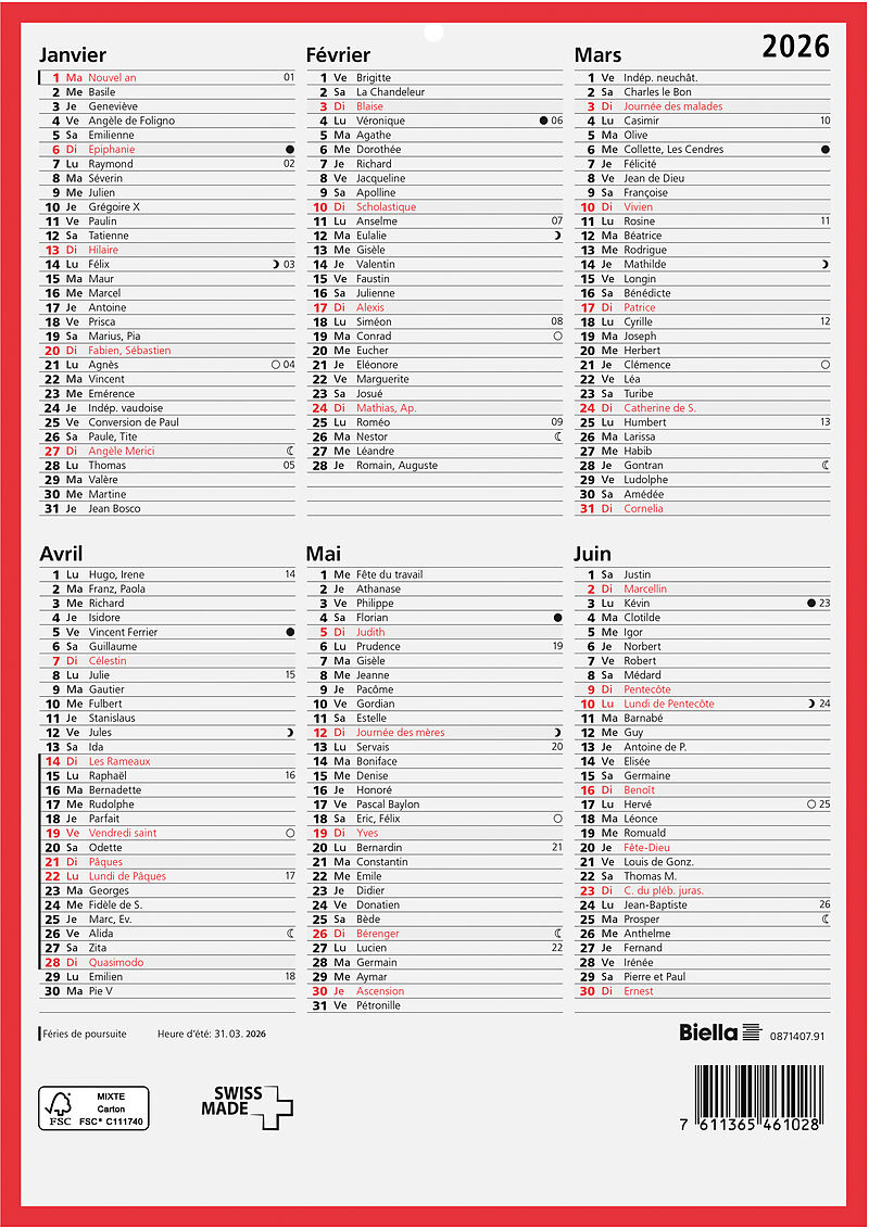 Tafelkalender Der Biella Tafelkalender bietet Ihnen in unterschiedlichen Formaten einen 6-monatigen Überblick. Mit Notizfeldern, Mondphase und Namenstagen. Besonders beliebt für die Waschküchen-Planung. 6 Monate / 1 Seite 21 x 29.7 cm Mondphasen und Namenstag...