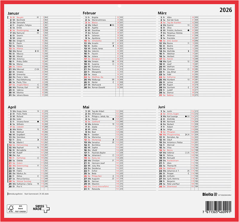 Tafelkalender Der Biella Tafelkalender bietet Ihnen in unterschiedlichen Formaten einen 6-monatigen Überblick. Mit Notizfeldern, Mondphase und Namenstagen. Besonders beliebt für die Waschküchen-Planung. 6 Monate / 1 Seite 32 x 29.7 cm Mondphasen und Namenstag...