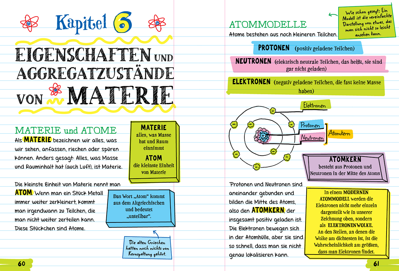 Keine Lust auf naturwissenschaftliche Fächer? Damit ist jetzt Schluss. So bekommst Du den Schulstoff von der 5. bis zur 9. Klasse in den Griff! Für bessere Noten! Erfahre alles über ... ... die Erde und unser Sonnensystem ... wissenschaftliches Forschen ... Newtons Gesetze der Mechanik ... die Elemente ... Energie ... Klima ... Zelltheorie ... den menschlichen Körper ... Ökosysteme und vieles mehr. Mit Definitionen, Lerntipps, Übungsseiten, Lösungen und Doodles Umfassendes Nachschlagewerk und Übungsbuch in den Fächern Physik, Chemie, Biologie und Erdkunde für Schüler*innen von der 5. bis zur 9. Klasse. Optimal geeignet zur Vertiefung und Auffrischung schulischer Inhalte und zur Vorbereitung auf schulische Tests. Die ungewöhnliche Gestaltung mit Scribbles und Cartoons sowie witzige Kommentare sorgen für Auflockerung. Nach jedem Kapitel folgt ein Wissensquiz, Multiple-Choice-Test oder ein Lückentext zur Lernkontrolle.