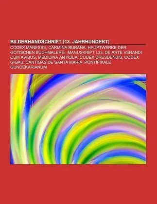 Quelle: Wikipedia. Seiten: 29. Kapitel: Codex Manesse, Carmina Burana, Hauptwerke der gotischen Buchmalerei, Manuskript I.33, De arte venandi cum avibus, Medicina antiqua, Codex Dresdensis, Codex Gigas, Cantigas de Santa Maria, Pontifikale Gundekarianum, Haupt...