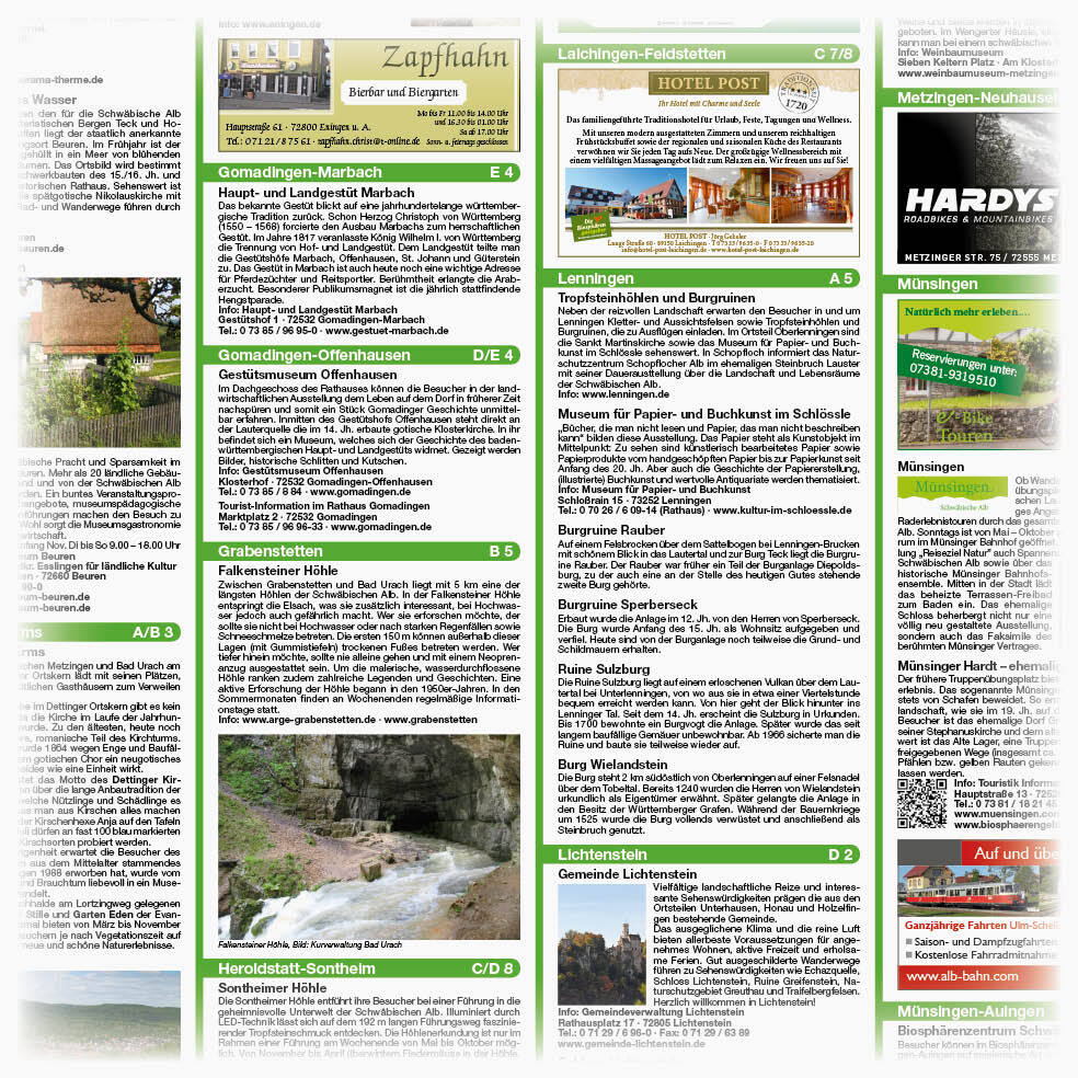 Die Schwäbische Alb (650 850 m ü. NN) stellt für konditionsstarke Radler und Wanderer eine Herausforderung dar. Zahlreiche Rad- und Wanderwege mit entsprechenden Steigungen lassen die wald-, höhlen- und burgenreiche Gegend erkunden. Erwähnenswert: eigens einge...