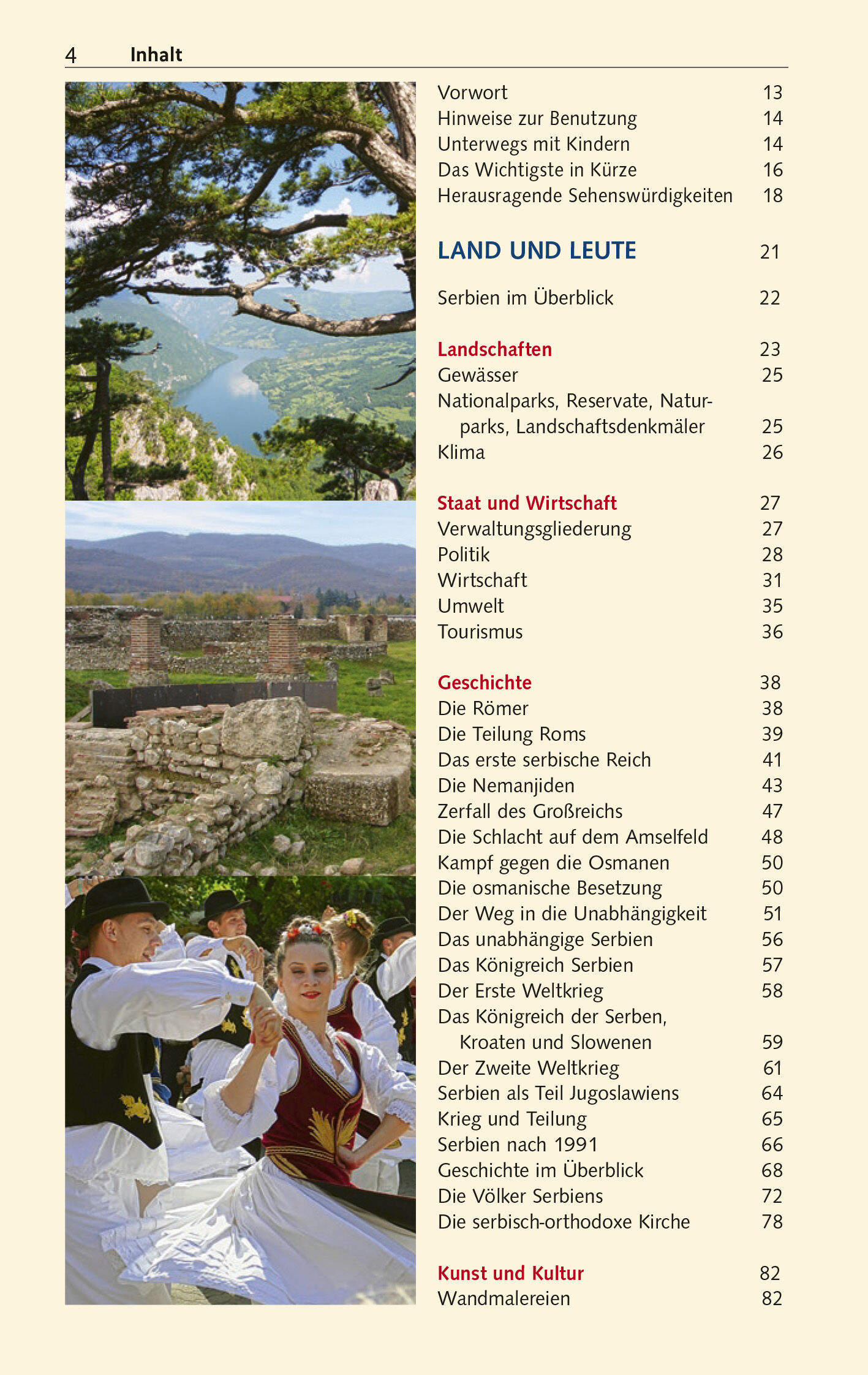 Vorwort 13 Hinweise zur Benutzung 14 Unterwegs mit Kindern 14 Das Wichtigste in Kürze 16 Herausragende Sehenswürdigkeiten 18 LAND UND LEUTE 21 Serbien im Überblick 22 Landschaften 23 Gewässer 25 Nationalparks, Reservate, Naturparks, Landschaftsdenkmäler 25 Klima 26 Staat und Wirtschaft 27 Verwaltung…