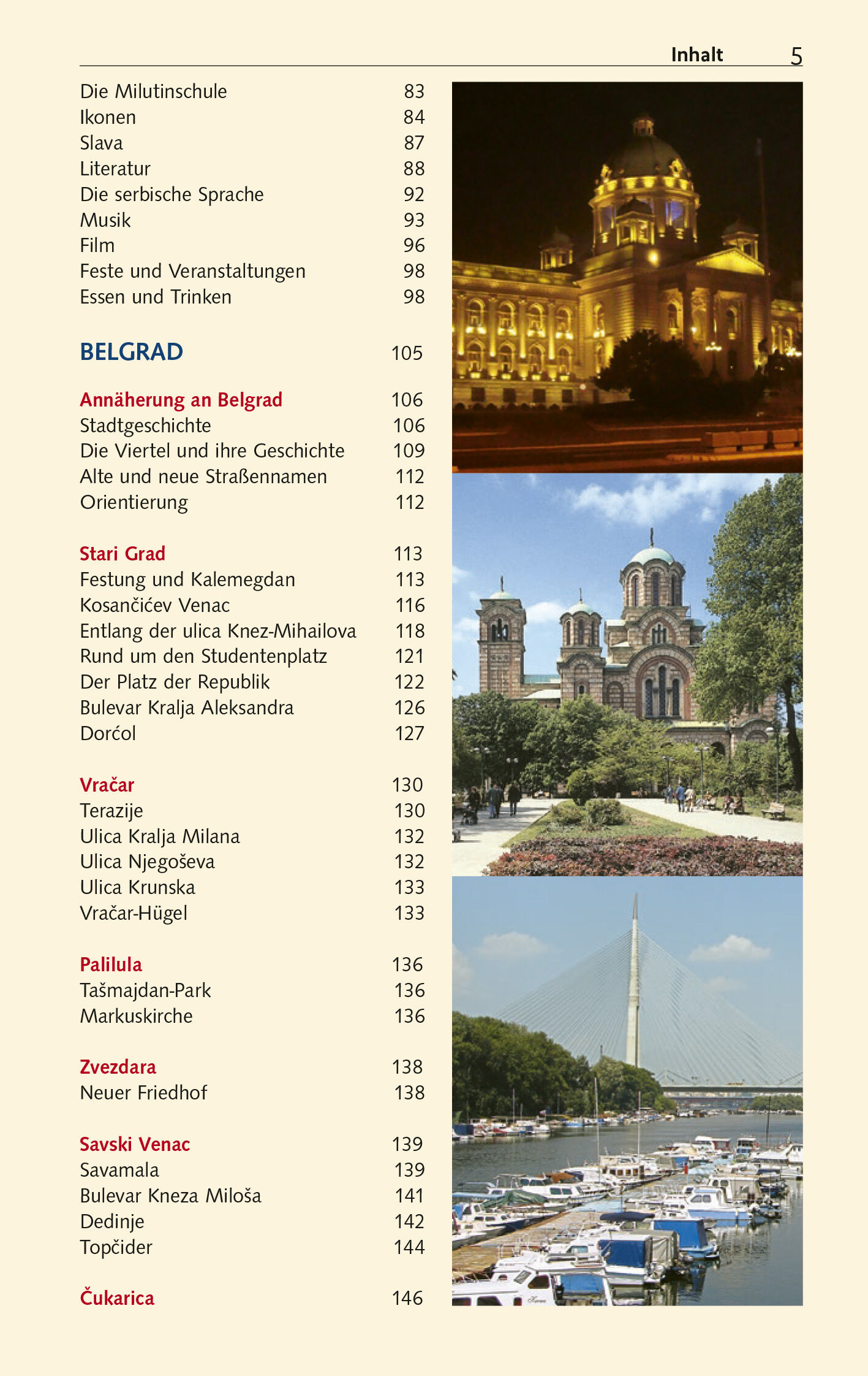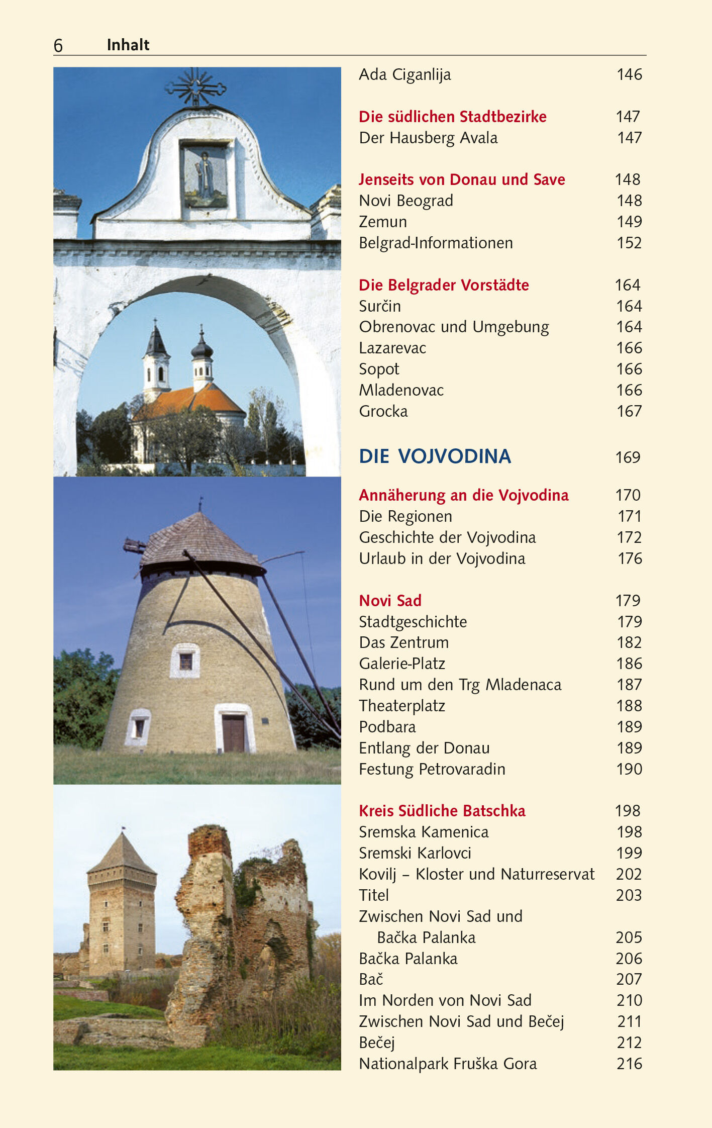 Alle Regionen des alten Kulturlands an Save, Theiß und Donau werden ausführlich vorgestellt. Neben der lebendigen Metropole Belgrad mit vibrierendem Nachtleben beschreibt der Titel ebenso detailliert die größeren Städte Novi Sad, Hauptstadt der Vojvodina, Ni als wirtschaftlichen und kulturellen Mittelpunkt Südserbiens oder die Jugendstilperle Subotica. Er widmet sich intensiv auch den kleineren Orten wie dem Barockjuwel Sremski Karlovci, Tor zum Nationalpark Fruka Gora, erläutert das architektonische Erbe der Römer, Osmanen und Habsburger und führt zu beeindruckenden Ausgrabungsstätten, Festungen und Moscheen. Ein besonderer Schwerpunkt liegt auf den Kunstwerken der unzähligen, oft sehr schön gelegenen orthodoxen Klöster, von denen zwei, Studenica und Sopoani, sogar zum Welterbe der UNESCO gehören.
