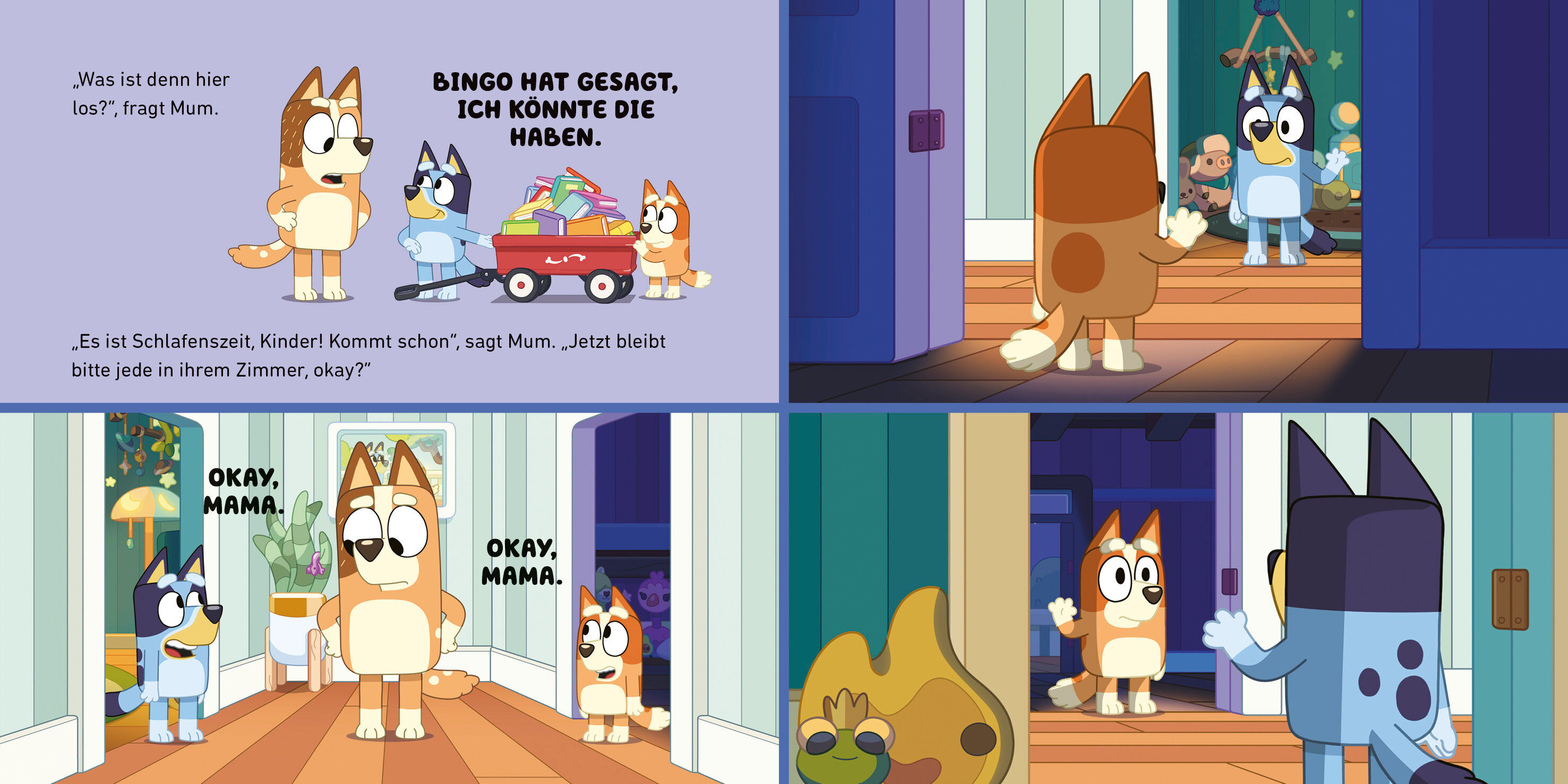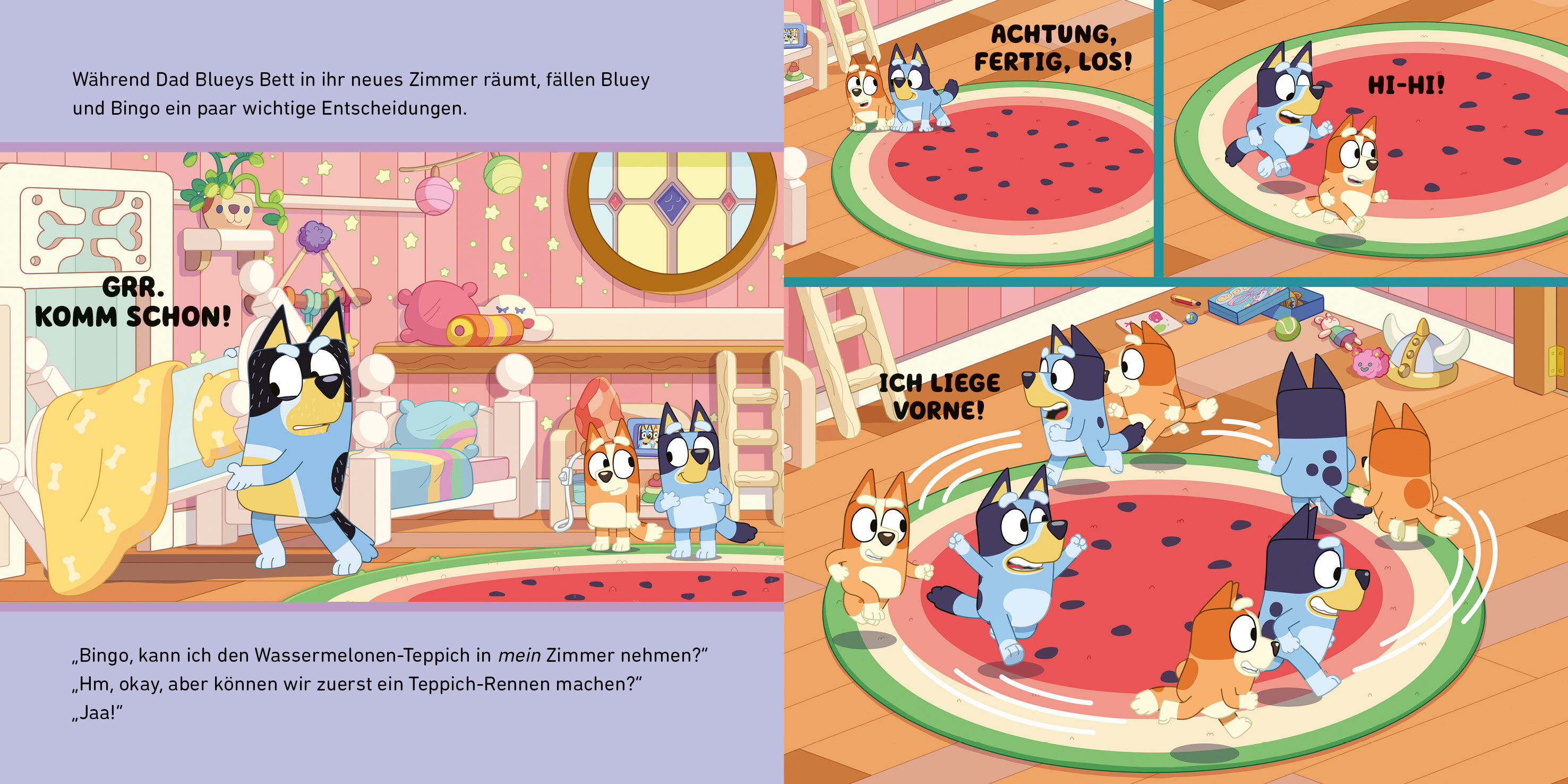 Alt genug für eigene Zimmer? Als Bluey, Bingo und ihre Eltern das Gästezimmer ausmisten, hat Bluey eine Idee: Das könnte doch ihr Zimmer werden! Dann hätten sie und Bingo eigene Zimmer. Also räumt Dad Blueys Bett ins Gästezimmer. Sie darf auch den Wassermelone...