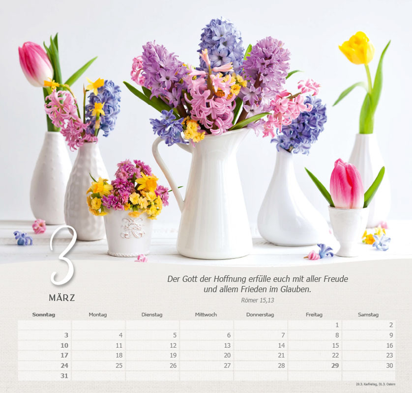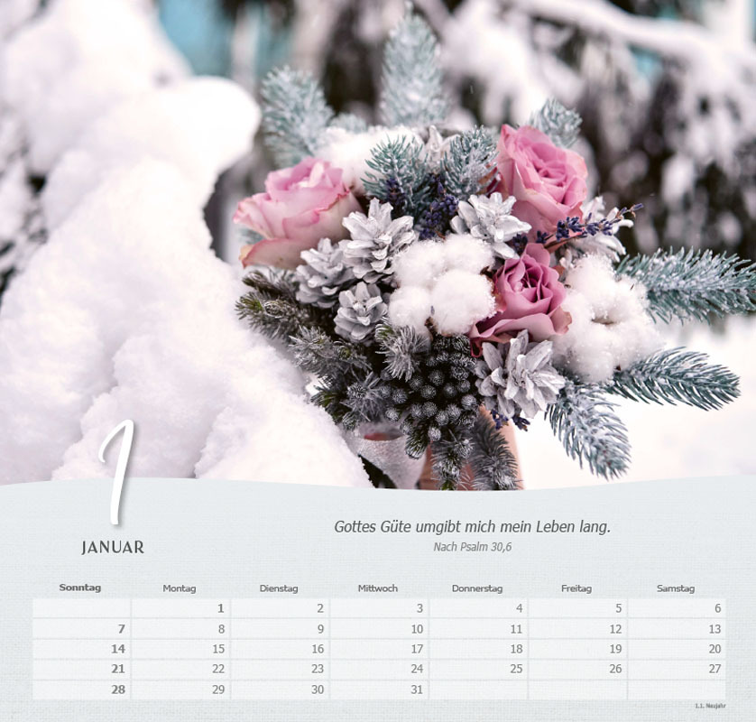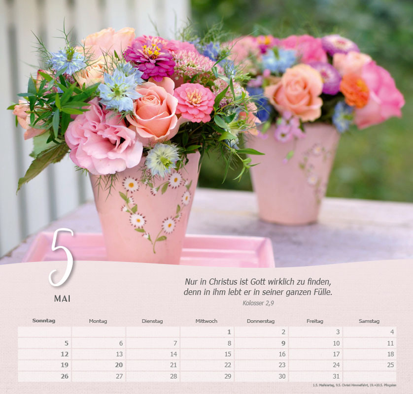 Wundervoll arrangierte Blumenbouquets enthält dieser spezielle Kalender. Modernes Design mit der Möglichkeit, Termine zu notieren. Mit passenden Bibelversen. Auch als Tischkalender (ohne Termineintragung)