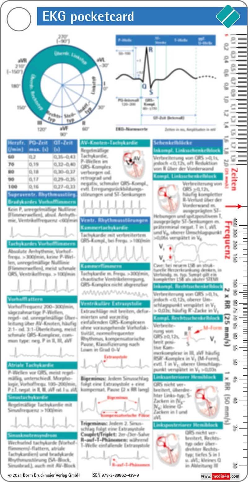 Die EKG pocketcard gibt einen differenzierten Überblick über EKG-Normwerte und über alle wichtigen pathologischen EKG-Veränderungen, mit Cabrera-Kreis, Infarktstadien und -lokalisationen und EKG-Linealen zu verschiedenen Papierlaufgeschwindigkeiten.