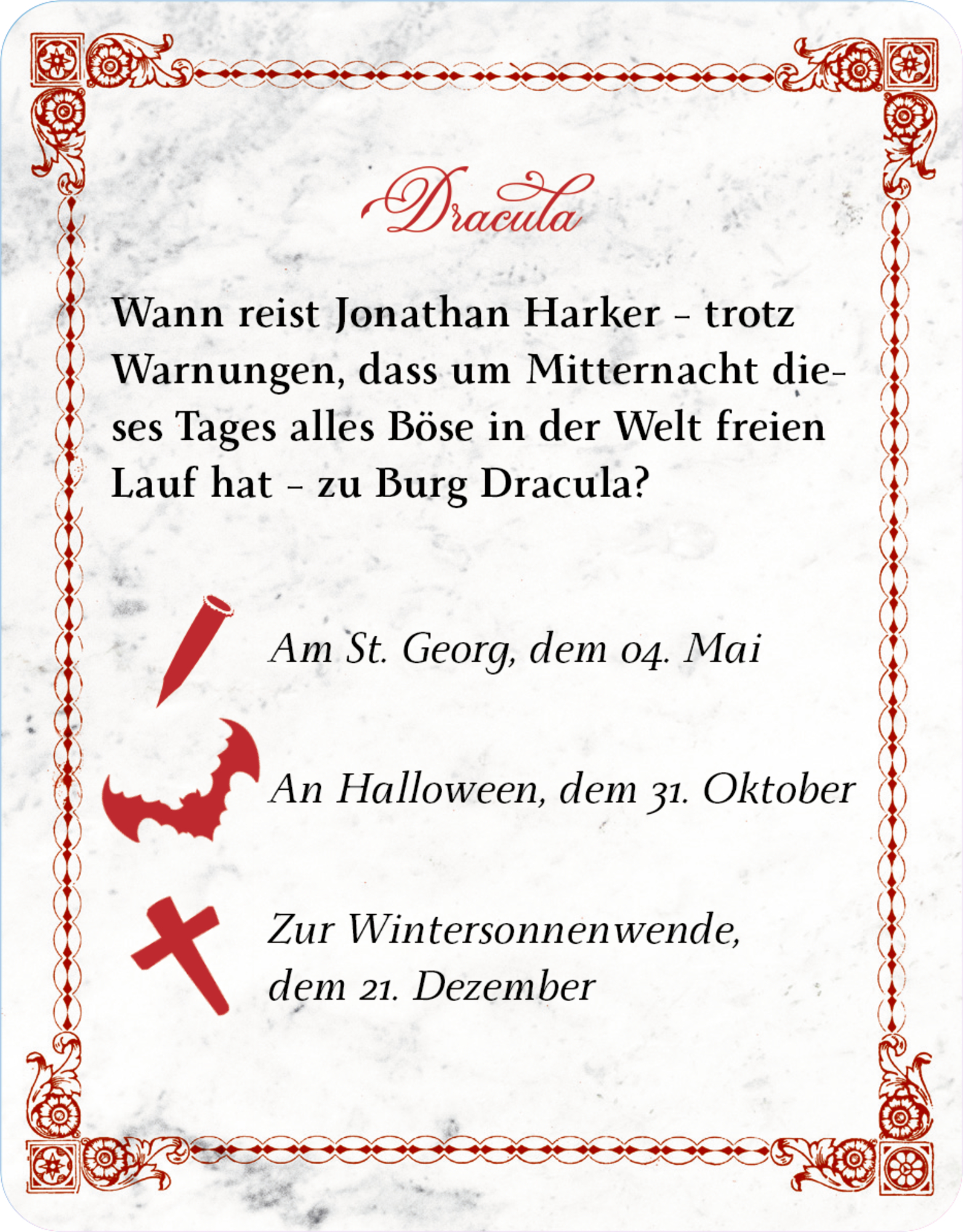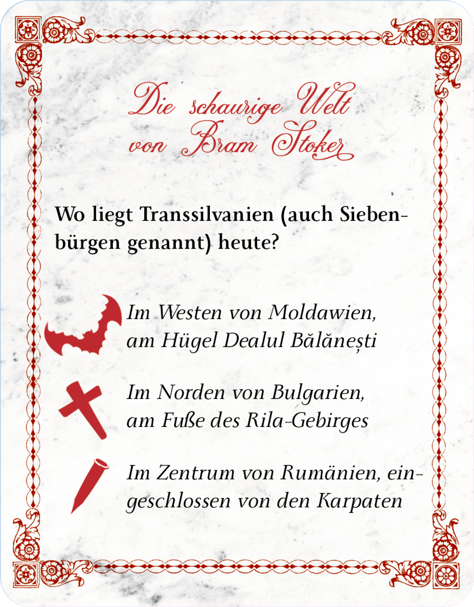 Wie hieß Bram Stokers erster Roman? Woher stammt Draculas Name? Und womit versiegelt Dr. van Helsing Lucys Gruft? Rätseln Sie sich in 40 spannenden Fragen durch die gruselige Welt von Bram Stoker und seinem berühmten Roman Dracula! Das Quiz zu einem der große...
