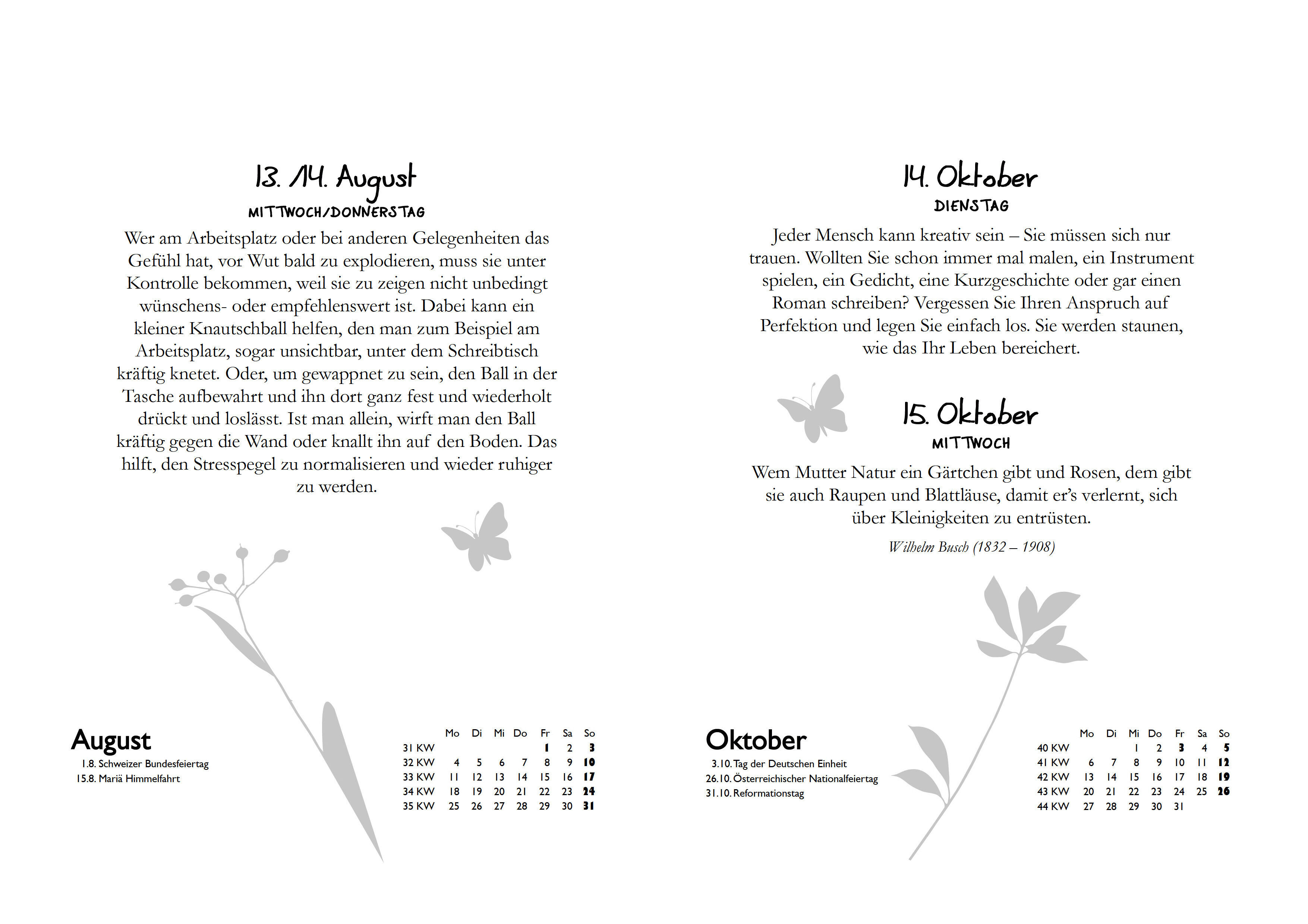 Um die Alltagsprobleme besser bewältigen zu können, wünschen sich viele mehr Gelassenheit. Achtsamkeit ist ein wunderbarer Weg, um auch bei Stress und hohen Anforderungen entspannt zu reagieren oder zu bleiben.Tag für Tag bietet dieser Kalender Anregungen, Übu...