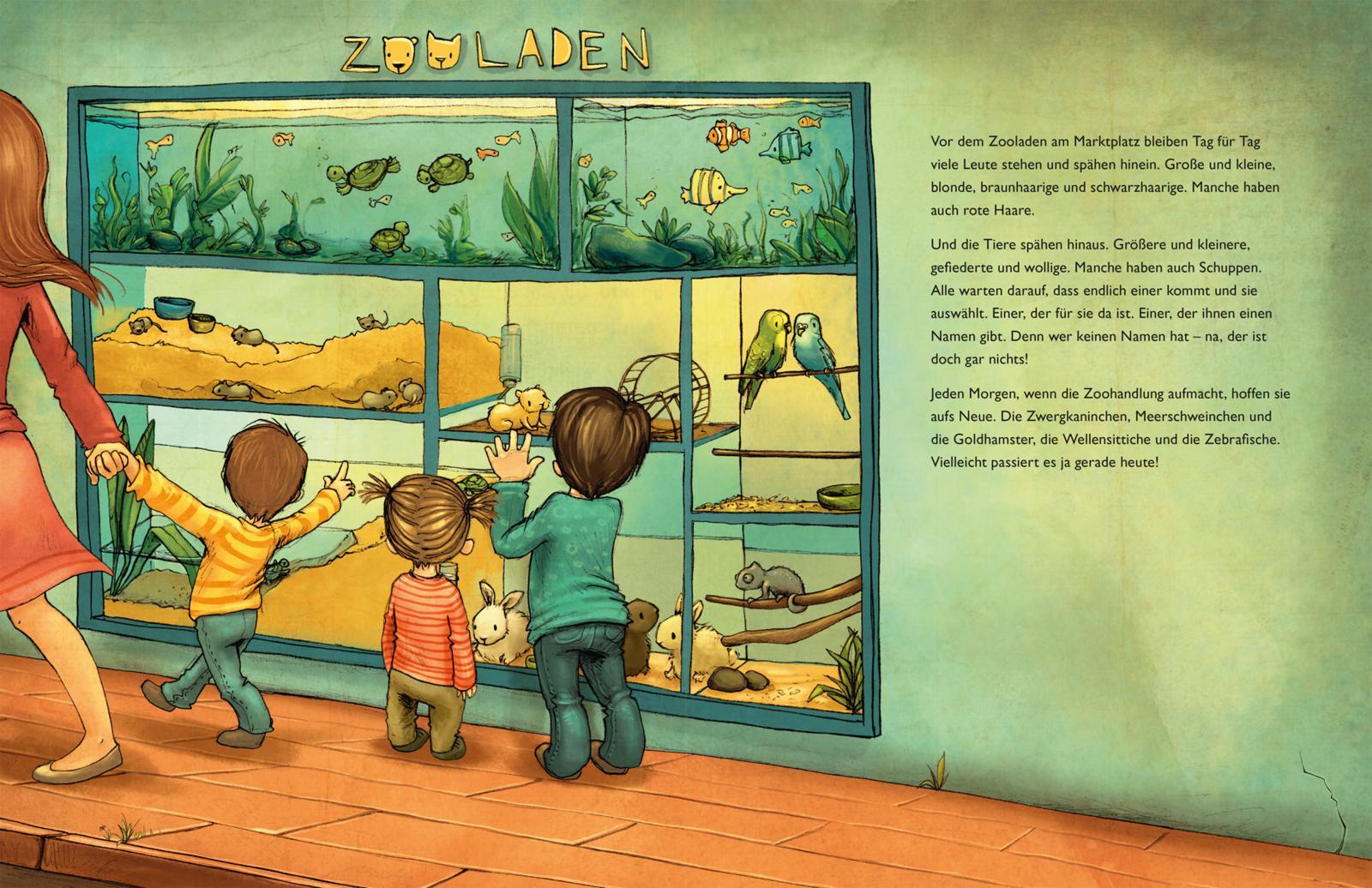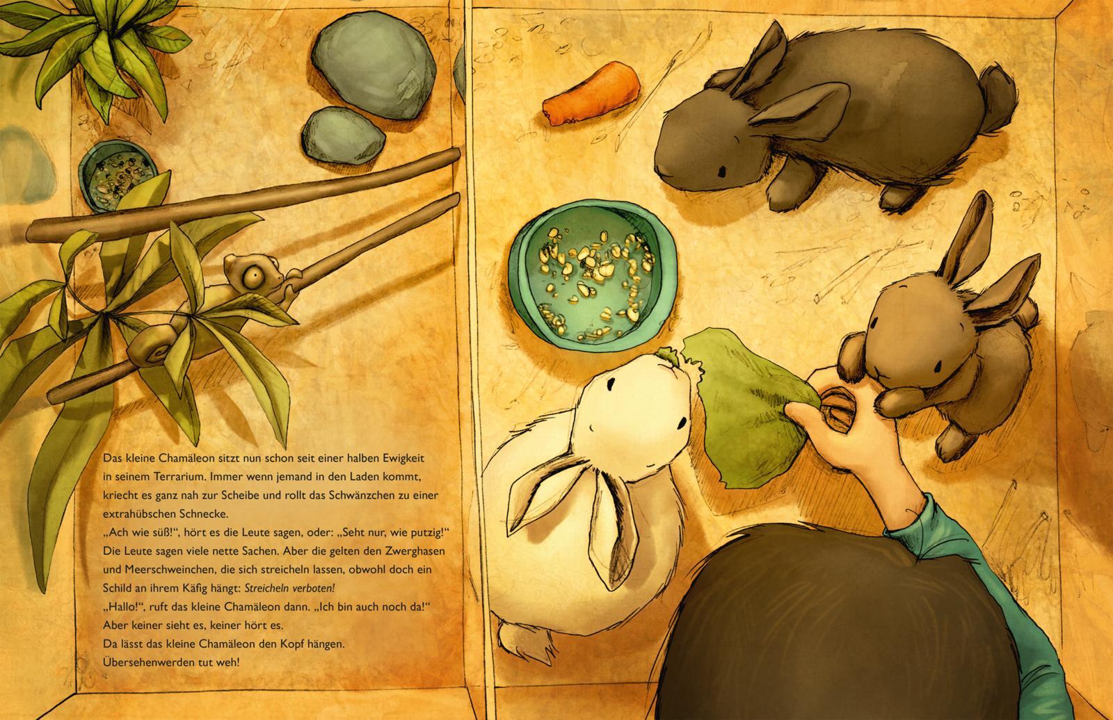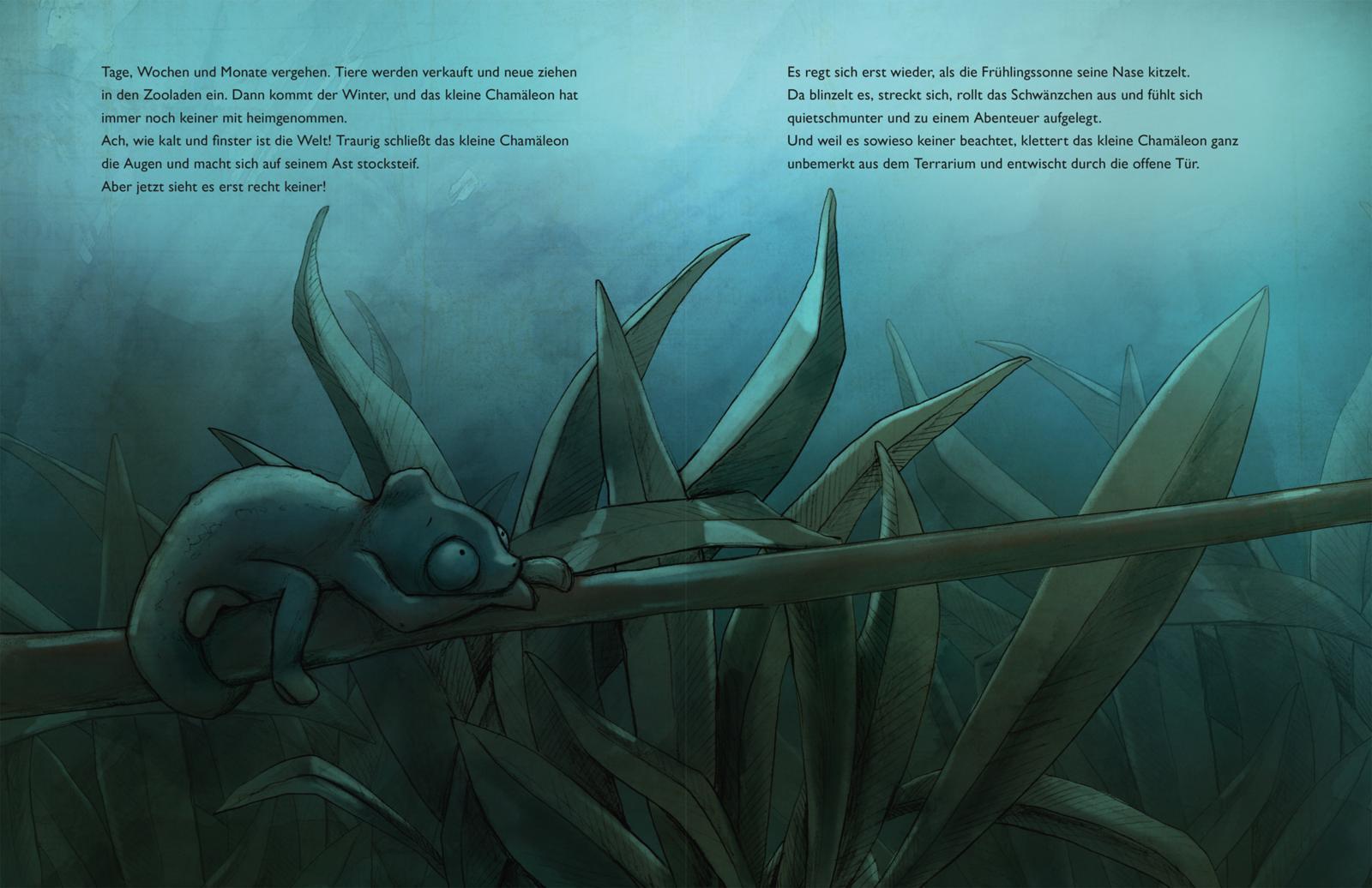 In einer Zoohandlung in einem Terrarium lebt ein kleines Chamäleon und wartet darauf, einen Besitzer zu finden. "Hallo, ich bin auch noch da!", ruft es. Aber keiner beachtet es. Da nimmt es eines Tages all seinen Mut zusammen und reißt aus. In der Menschenwel...