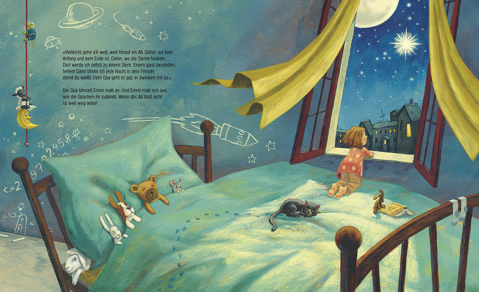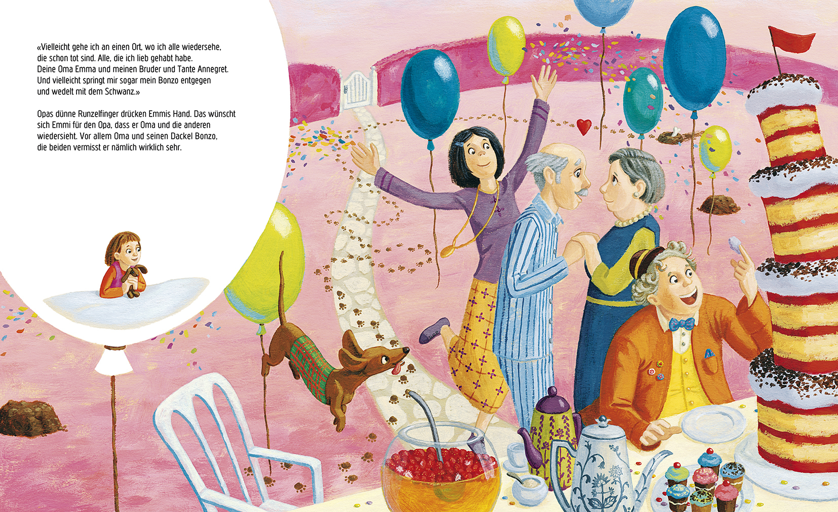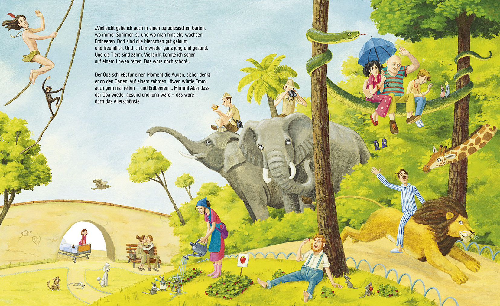 Emmis Opa ist sehr, sehr krank. Vielleicht muss er von ihr gehen. 'Opa? Wo willst du denn hingehen?', fragt Emmi leise. Der Opa dreht ihr den Kopf zu und schaut sie lange an. 'Es ist ein Geheimnis und ein Abenteuer', flüstert er schließlich. Emmi mag Geheimnis...