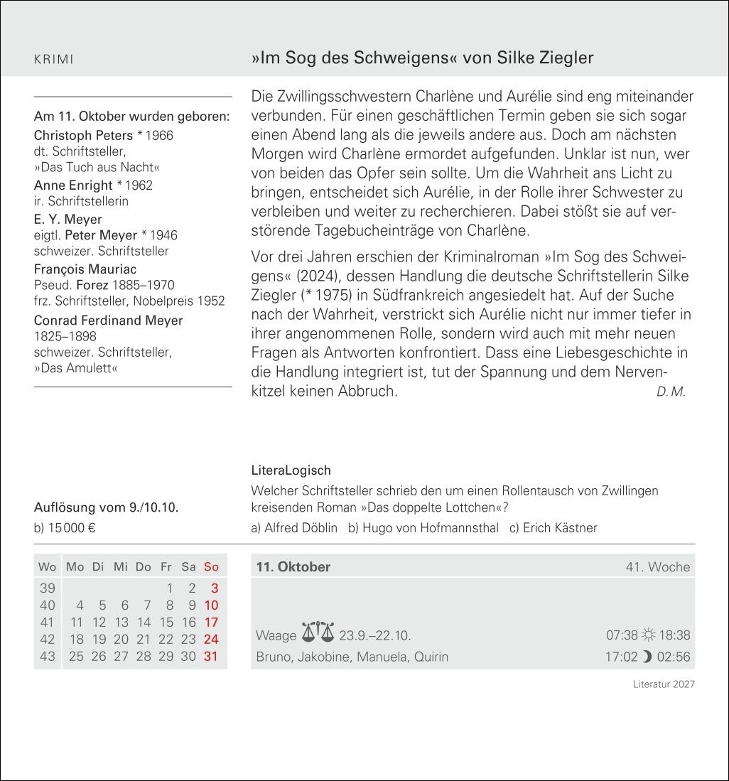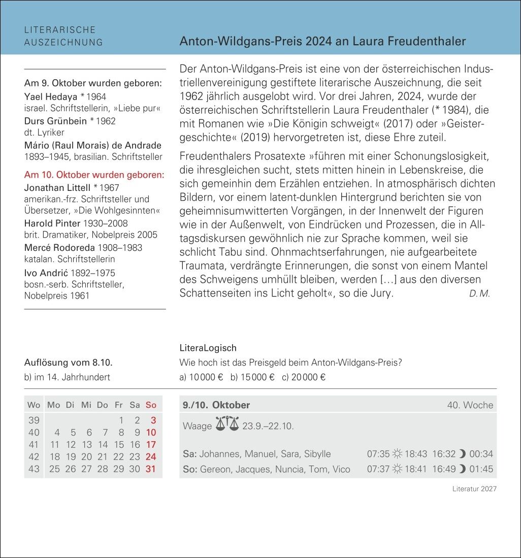 - Literarische Anregungen für jeden Tag, von Roman über Hörbuch bis zur Lyrik: Der Harenberg Literatur-Abreißkalender 2027 - Auf Streifzug durch die Welt der Bücher: Tischkalender mit Lesetipps aus allen Genres, spannenden Porträts von Autorinnen und Autoren, ...
