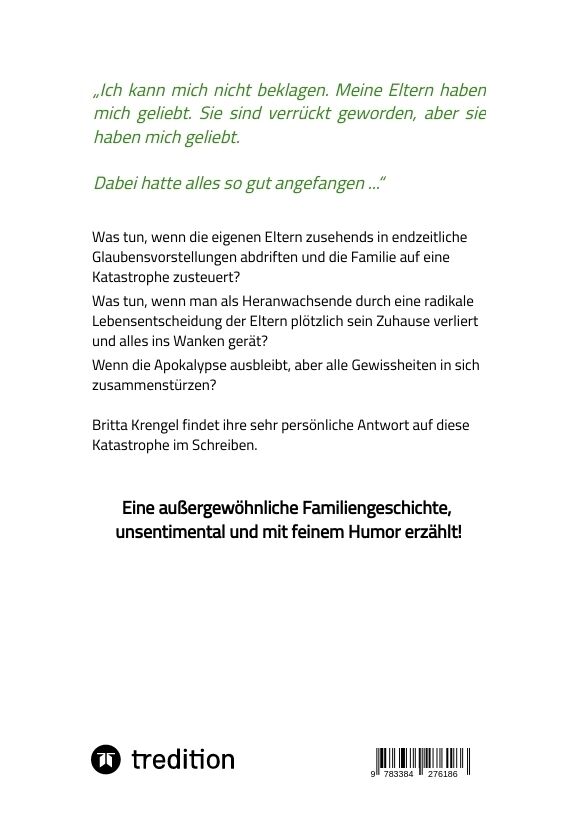 Was tun, wenn die eigenen Eltern zusehends in endzeitliche Glaubensvorstellungen abdriften und die Familie unaufhaltsam auf eine Katastrophe zusteuert? Was tun, wenn man als Heranwachsende durch eine radikale Lebensentscheidung der Eltern plötzlich sein Zuhaus...