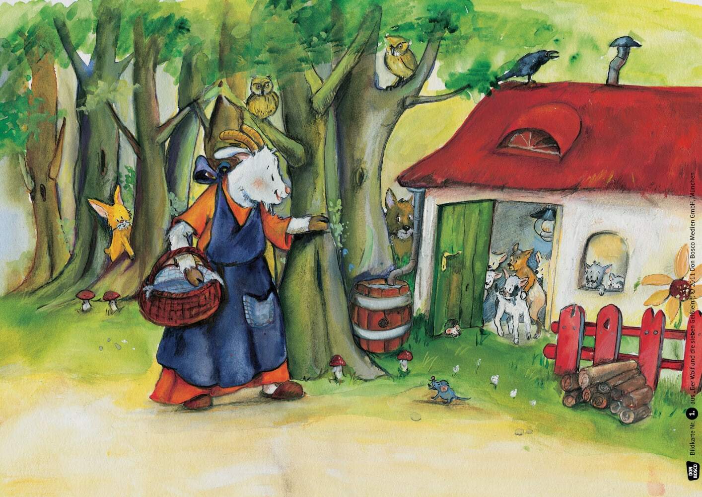 Seid auf der Hut vor dem bösen Wolf, sagt die alte Geiß noch, dann geht sie zur Tür hinaus. Wenig später klopft es! Doch die jungen Geißlein erkennen an der rauen Stimme, dass vor der Tür der Wolf steht. Also frisst der Wolf Kreide und klopft erneut an die Tür. Doch die Geißlein erkennen ihn an seiner schwarzen Pfote. Da bestreicht der Wolf seine Pfote mit Teig und die Ziegen lassen den Unhold hinein
