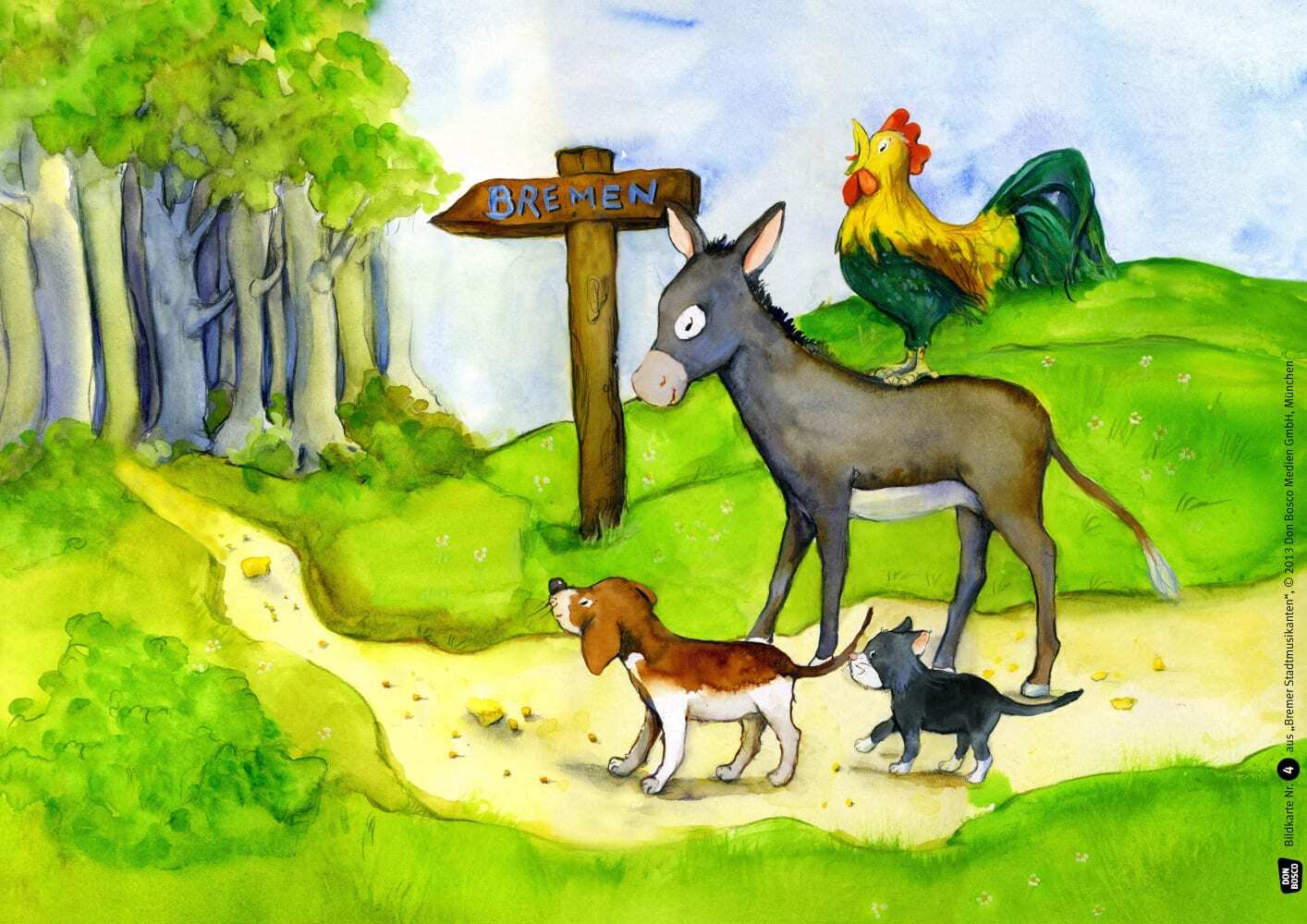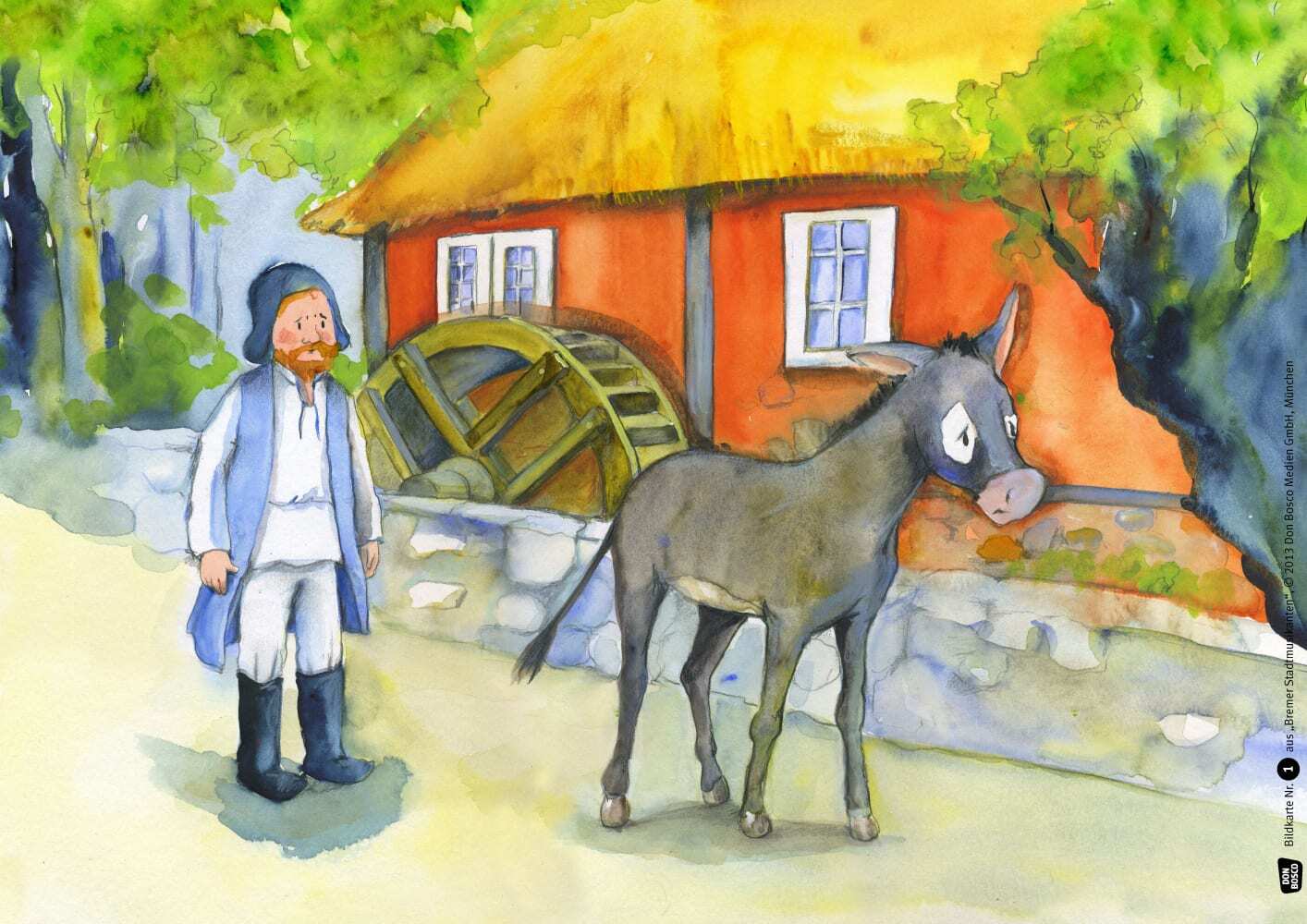 Jeder ist seines Glückes Schmied. Jahrelang hat der Esel für den Müller das Getreide geschleppt. Jetzt, da er alt und nicht mehr ganz so kräftig ist, will ihn der Meister loswerden. Ich reiße aus und werde Stadtmusikant! In Bremen. Auf seiner Reise trifft er einen Hund, eine Katze und einen Hahn. Als es Nacht wird, entdecken die vier Freunde ein Häuschen im Wald. Als sie merken, dass darin Räubern wohnen, verjagen sie die Bande und ziehen kurzerhand selbst dort ein ...