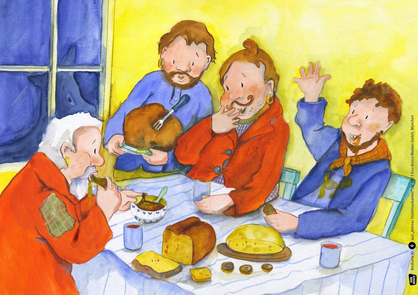 Jahrelang hat der Esel für den Müller das Getreide geschleppt. Jetzt, da er alt und nicht mehr ganz so kräftig ist, will ihn der Meister loswerden. "Ich reiße aus und werde Stadtmusikant! In Bremen." Auf seiner Reise trifft er einen Hund, eine Katze und einen Hahn. Als es Nacht wird, entdecken die vier Freunde ein Häuschen im Wald. Als sie merken, dass darin Räubern wohnen, verjagen sie die Bande und ziehen kurzerhand selbst dort ein. - Ein Märchen aus der Sammlung der Brüder Grimm.