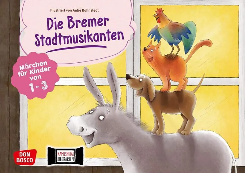 Der alte Esel soll fort, also macht er sich auf nach Bremen. Unterwegs trifft er Hund, Katze und Hahn. Gemeinsam finden sie nachts ein wundersames Haus im Wald und ziehen ein. Kamishibai mit Kindern im Krippenalter: Jahrelang hat der Esel das Getreide geschlep...