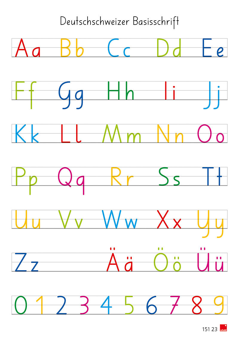 Die Buchstaben der Deutschschweizer Basisschrift im Großformat fürs Klassenzimmer. Poster im Format 70 x 100 cm, laminiert, dadurch beschreib- und abwischbar. Lieferung inklusive Leiste und Aufhängeschnur.