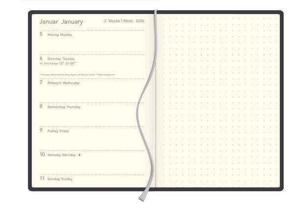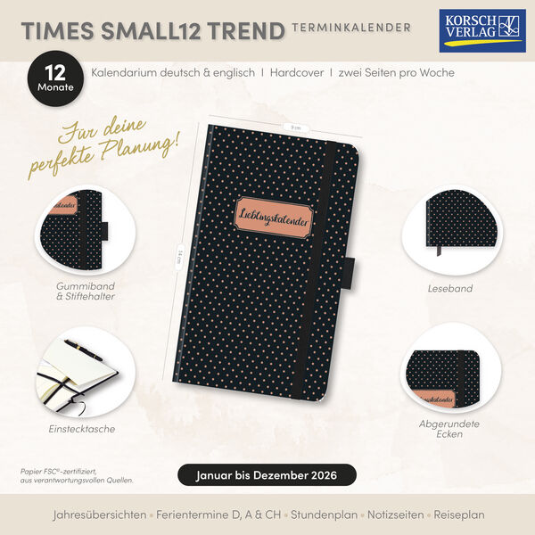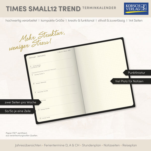 Produktmerkmale Taschenkalender im Format: 9 x 14 cm, 144 Seiten, umweltfreundliches FSC Papier Jede Doppelseite des 12 Monats-Kalendariums zeigt die Wochenübersicht sowie eine Seite für Notizen Kalendarium auf Deutsch und Englisch; Feiertagen für Deutschland...