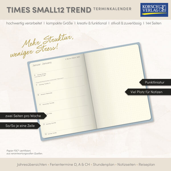 Produktmerkmale Taschenkalender im Format: 9 x 14 cm, 144 Seiten, umweltfreundliches FSC Papier Jede Doppelseite des 12 Monats-Kalendariums zeigt die Wochenübersicht sowie eine Seite für Notizen Kalendarium auf Deutsch und Englisch; Feiertagen für Deutschland...