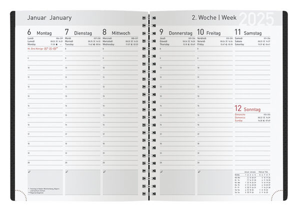 Produktmerkmale Buchkalender im Format: 14 x 20,5 cm, 128 Seiten, umweltfreundliches FSC Papier Pro Woche eine Doppelseite Extras: Jahresübersicht 2025/26, Platz für Notizen, Infoseiten rund um geschäftliche Themen Kalendarium auf Deutsch, Englisch, Französis...
