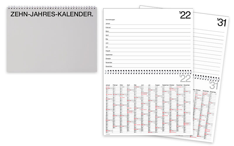 10-Jahreskalender Dieser 10-Jahreskalender von Bühner schenkt Ihnen einen Überblick über die nächsten zehn Jahre inkl. Sonn- und Festtage. Die Wochenmarkierungen sowie Schulferientermine sind in Deutscher Sprache definiert. 1 Jahr / 2 Seiten 29.7 x 21 cm...