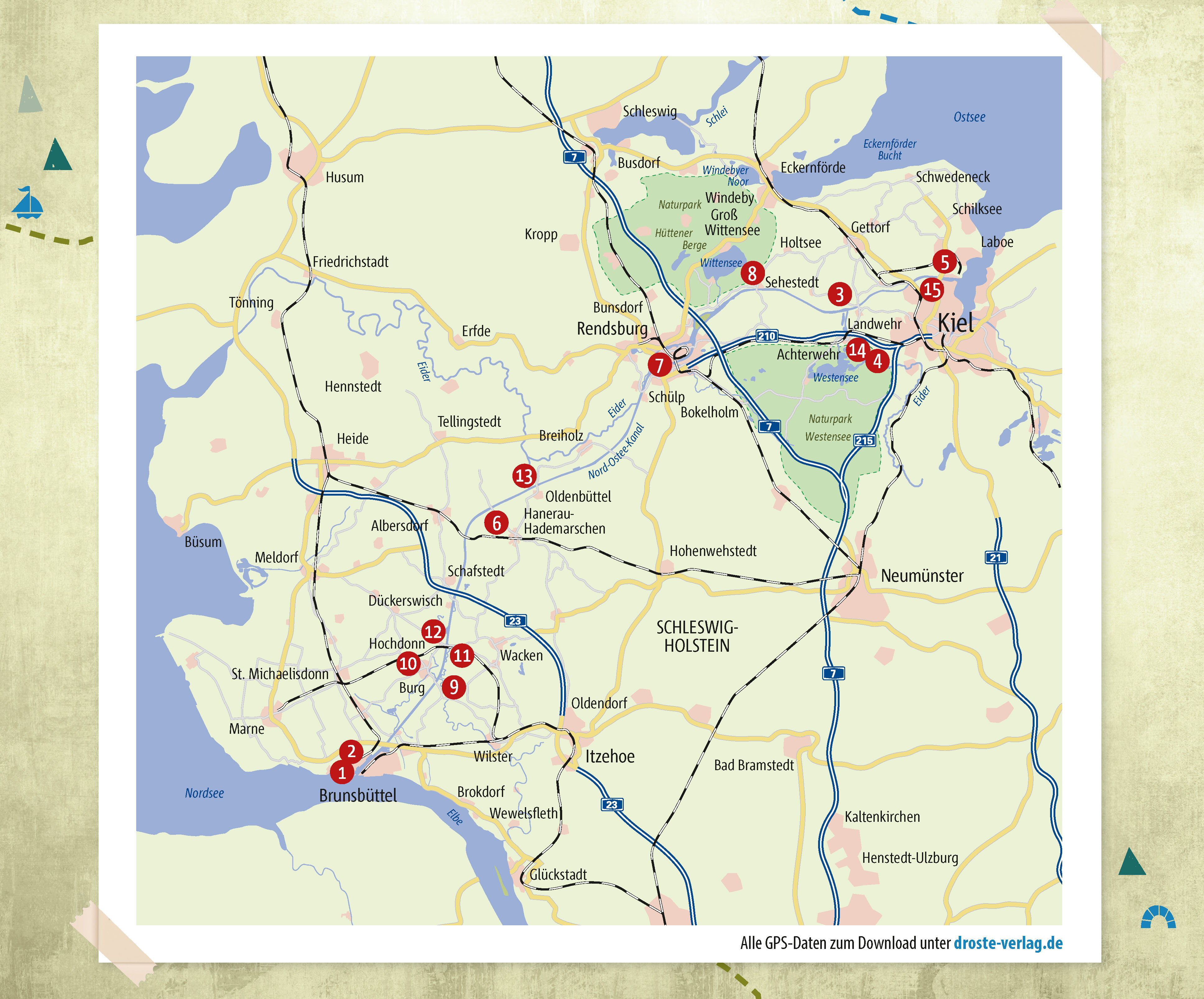 Vom Sattel aus lässt sich die Region am besten entdecken: die Holtenauer Hochbrücken mit ihren weiten Ausblicken, das Steinzeitdorf in Dithmarschen und gleich drei Leuchttürme in Glückstadt. Umgeben von üppiger Natur und sehenswerten Städten fließt das Wasser ...