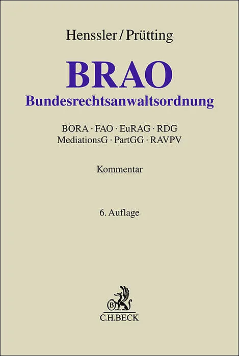 Schwerpunkt dieses Standardkommentars zum anwaltlichen Berufsrecht ist die umfassende und wissenschaftlich profunde, aber jederzeit praxisnahe Darstellung der Bundesrechtsanwaltsordnung (BRAO). Wegen der anhaltend großen Bedeutung der Fachanwaltschaften ist daneben auch die aktuelle Kommentierung der Fachanwaltsordnung (FAO) zu nennen. Außerdem werden alle anderen, berufsrechtlich relevanten Gesetze kommentiert, z.B. die Anwaltliche Berufsordnung (BORA), das Rechtsdienstleistungsgesetz (RDG), das Partnerschaftsgesellschaftsgesetz (PartGG), das Mediationsgesetz (MediationsG) sowie die Rechtsanwaltsverzeichnis- und -postfachverordnung (RAVPV).