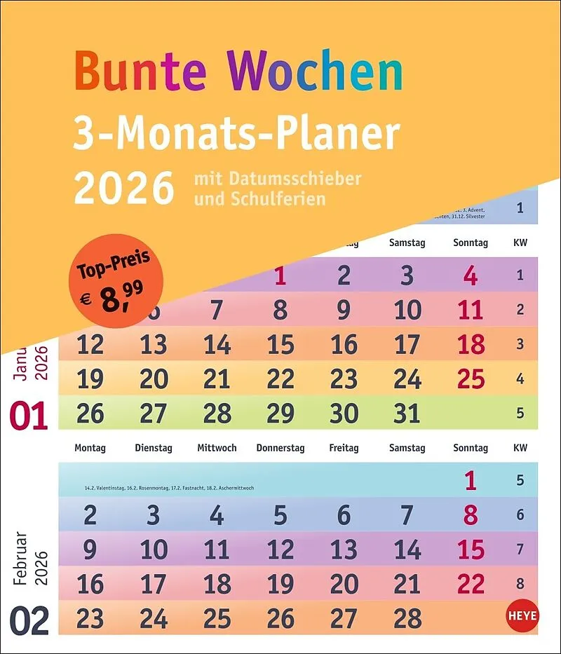 - Nie wieder im Datum irren: mit dem Bunte Wochen 3-Monats-Kalender behalten Sie alles im Blick und nicht nur die aktuelle Woche - Farbenfroh und zugleich neutral: Kalender ohne störende Designelemente im platzsparenden Format 30 x 35 cm - Ein Terminkalender, ...