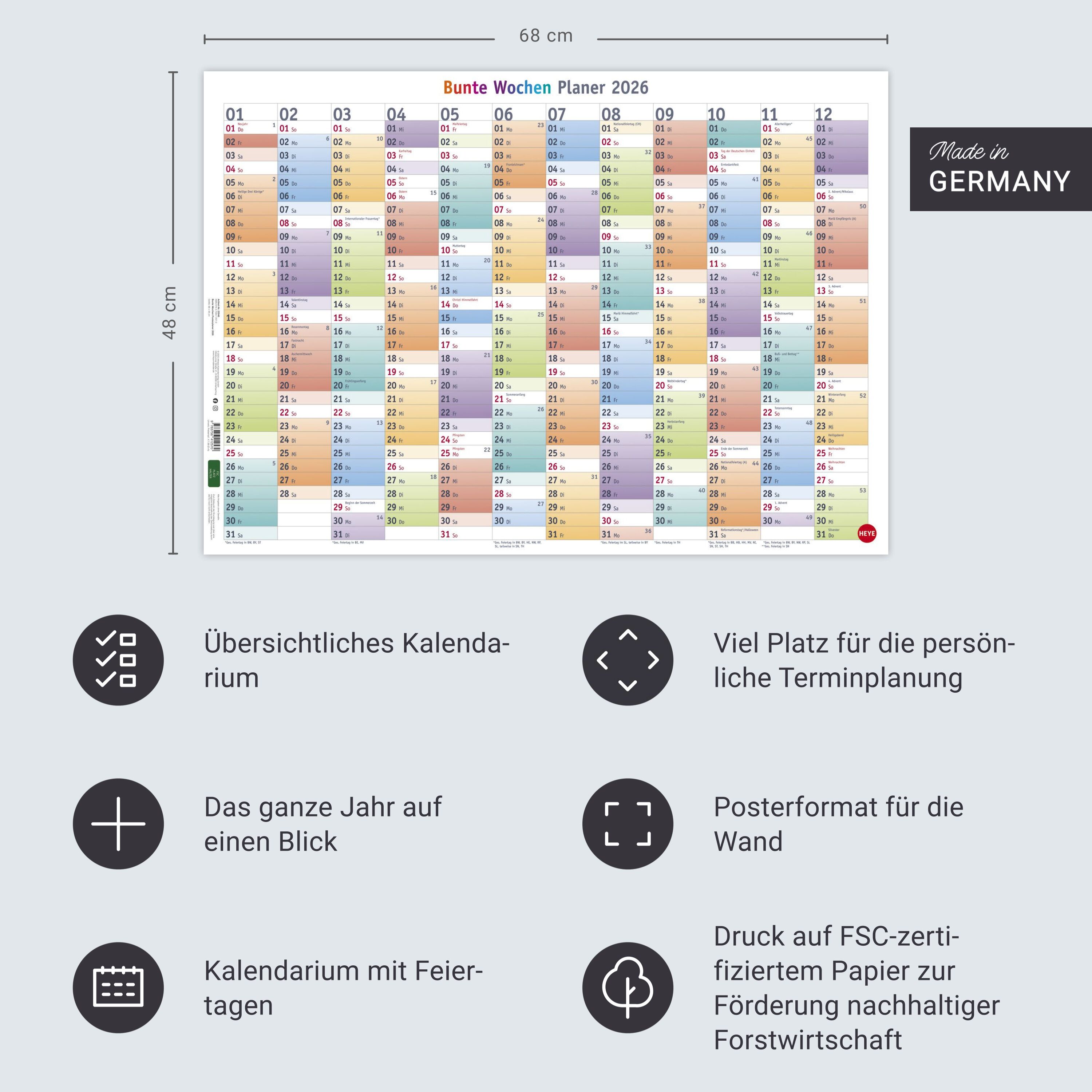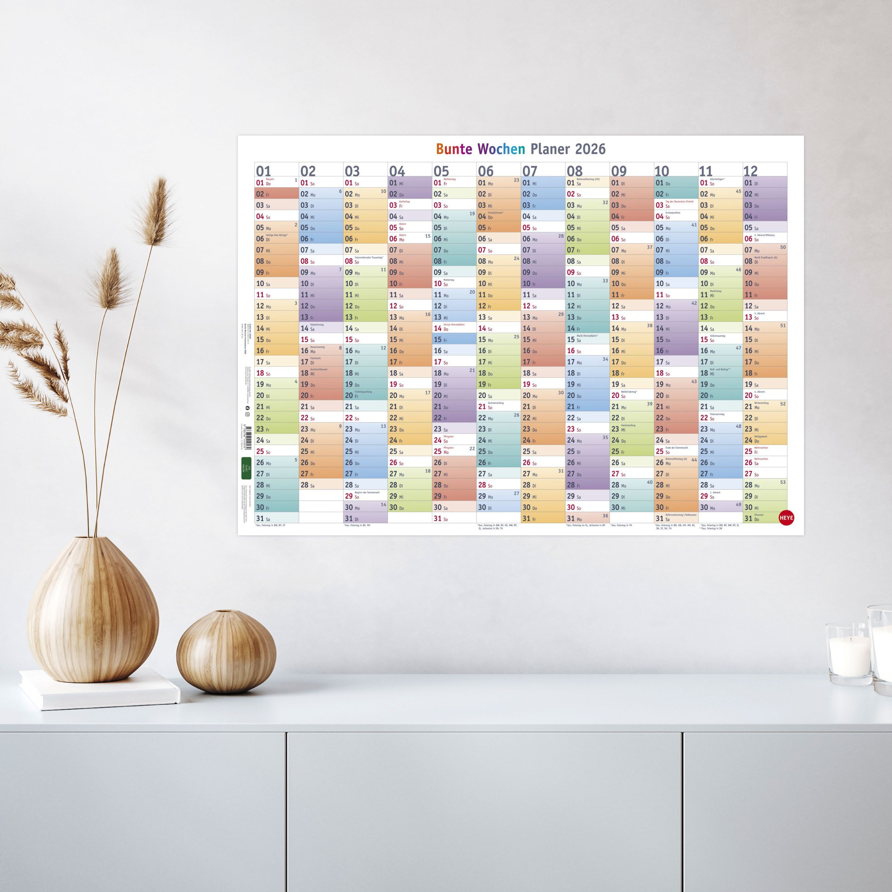 Nie den Überblick verlieren mit dem 68 x 48 cm Wandkalender 2026 zum Eintragen Reduziert auf das Wesentliche und doch ein Hingucker: Bunte Wochen das beliebte Kalender-Design für alle, die viel zu organisieren haben Das ganze Jahr auf einen Blick: Auf dem Plan...