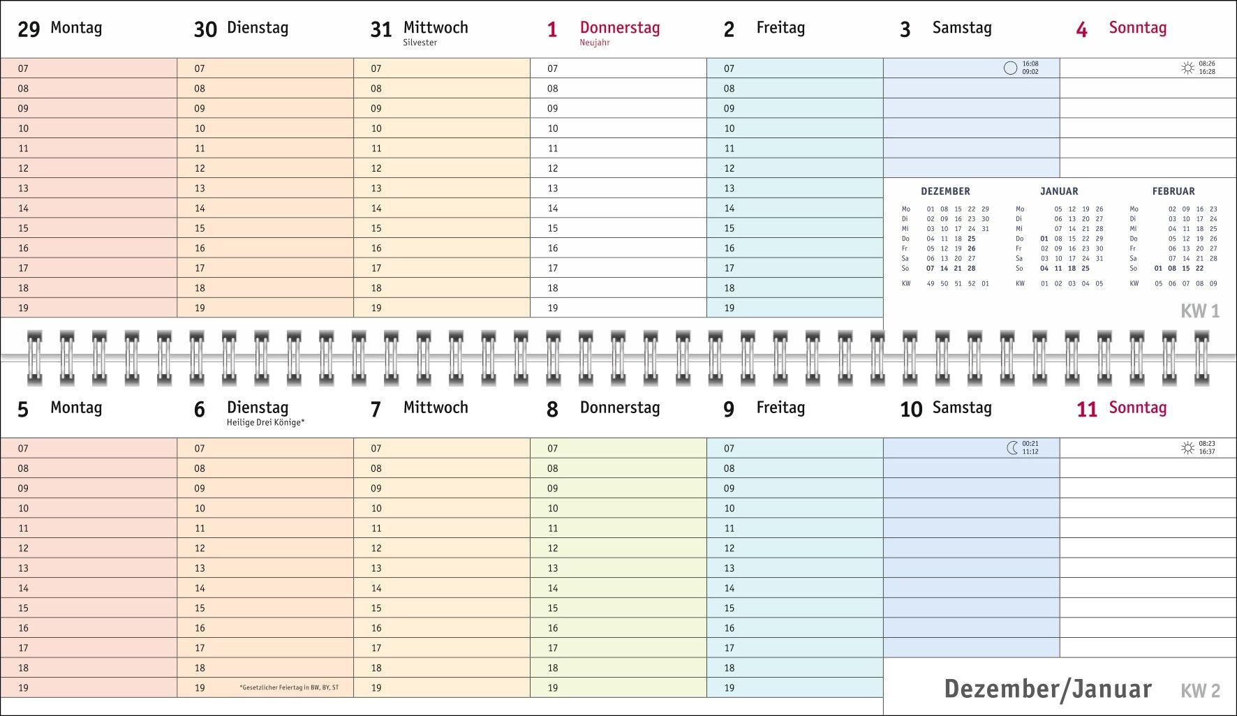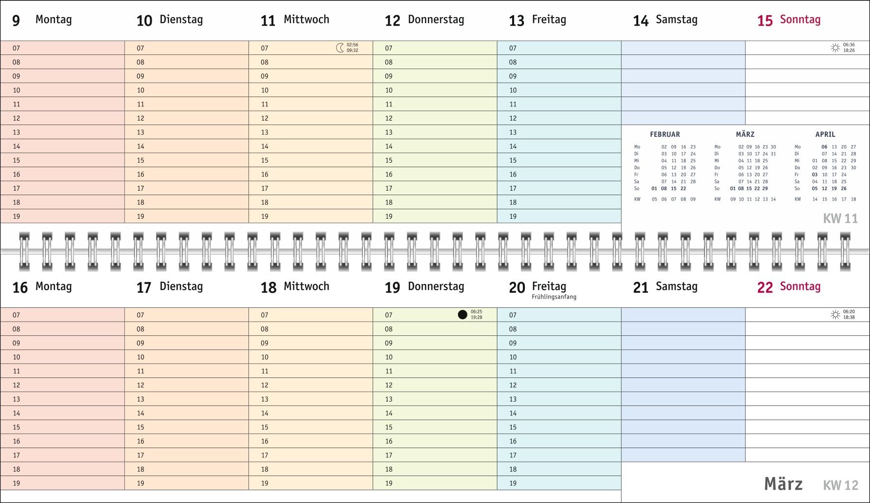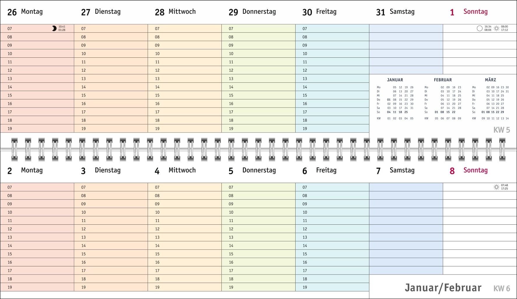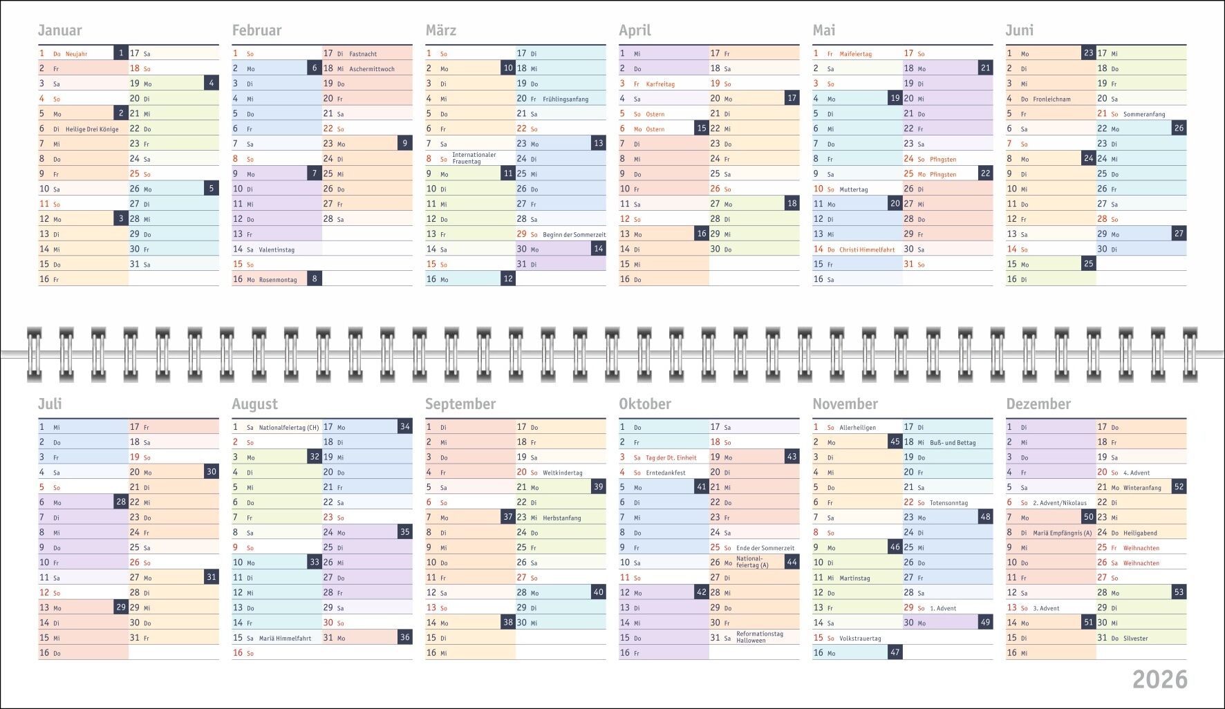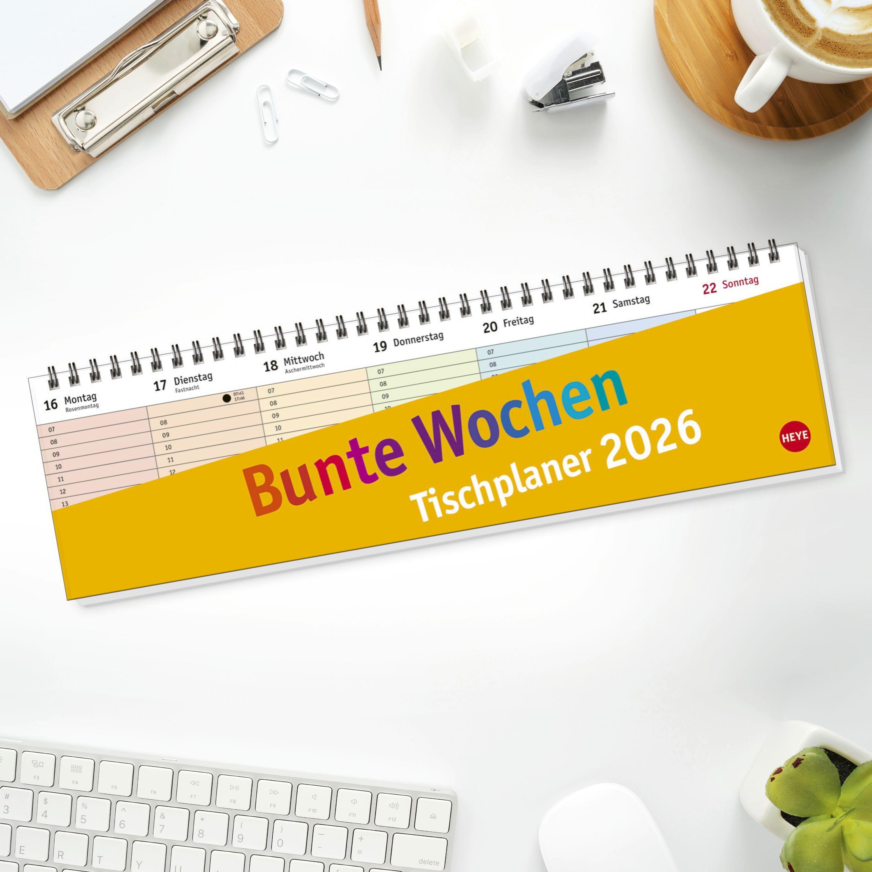 Ein farbenfroher Organisations-Allrounder: Der Bunte-Wochen-Tischkalender 2026 Meetings, Konferenzen, To-dos: Querplaner im Format 32,5 x 9,3 cm mit viel Platz für alle wichtigen Termine Hier fällt keine Abgabefrist unter den (Büro-)Tisch: Jeder Tag in einer a...