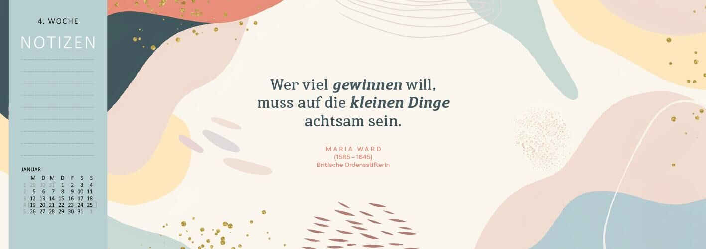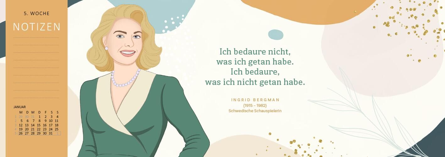 Inspirierender Kalender zum Aufstellen mit Zitaten von berühmten Frauen Sich von klugen, starken, mutigen Frauen und ihren Lebensweisheiten inspirieren und motivieren lassen dieser Wochenplaner schenkt Freude an jedem Tag. Die Texte und Porträts sind eine Kra...