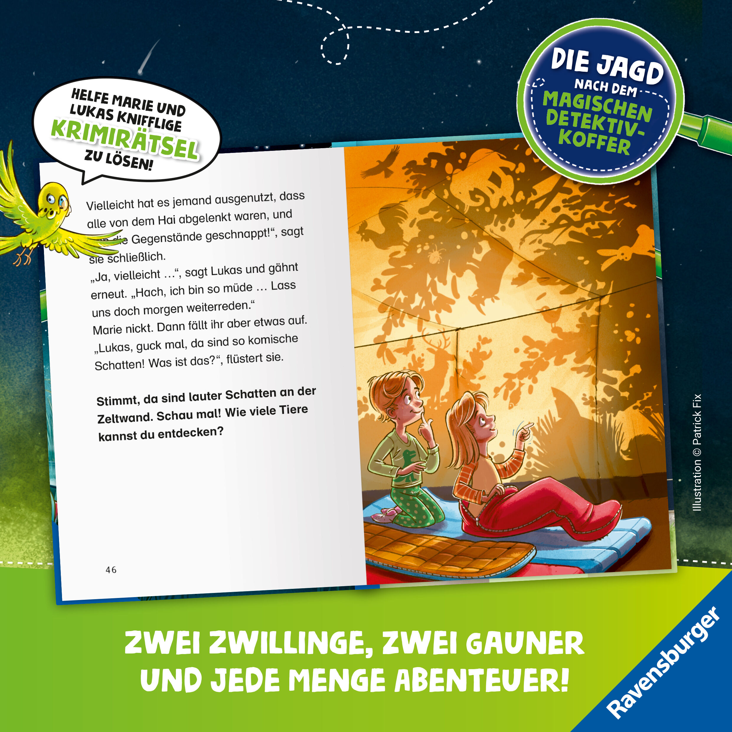 Auf zur wilden Kofferjagd! Endlich Ferien! Familie Stiefel macht Camping-Urlaub am Badesee. Auch Hund Sokrates, Katze Pfötchen und Wellensittich Brötchen dürfen nicht fehlen. Doch was ist das? Ein Hai treibt sein Unwesen im Badesee und stört die Camping-Idylle...