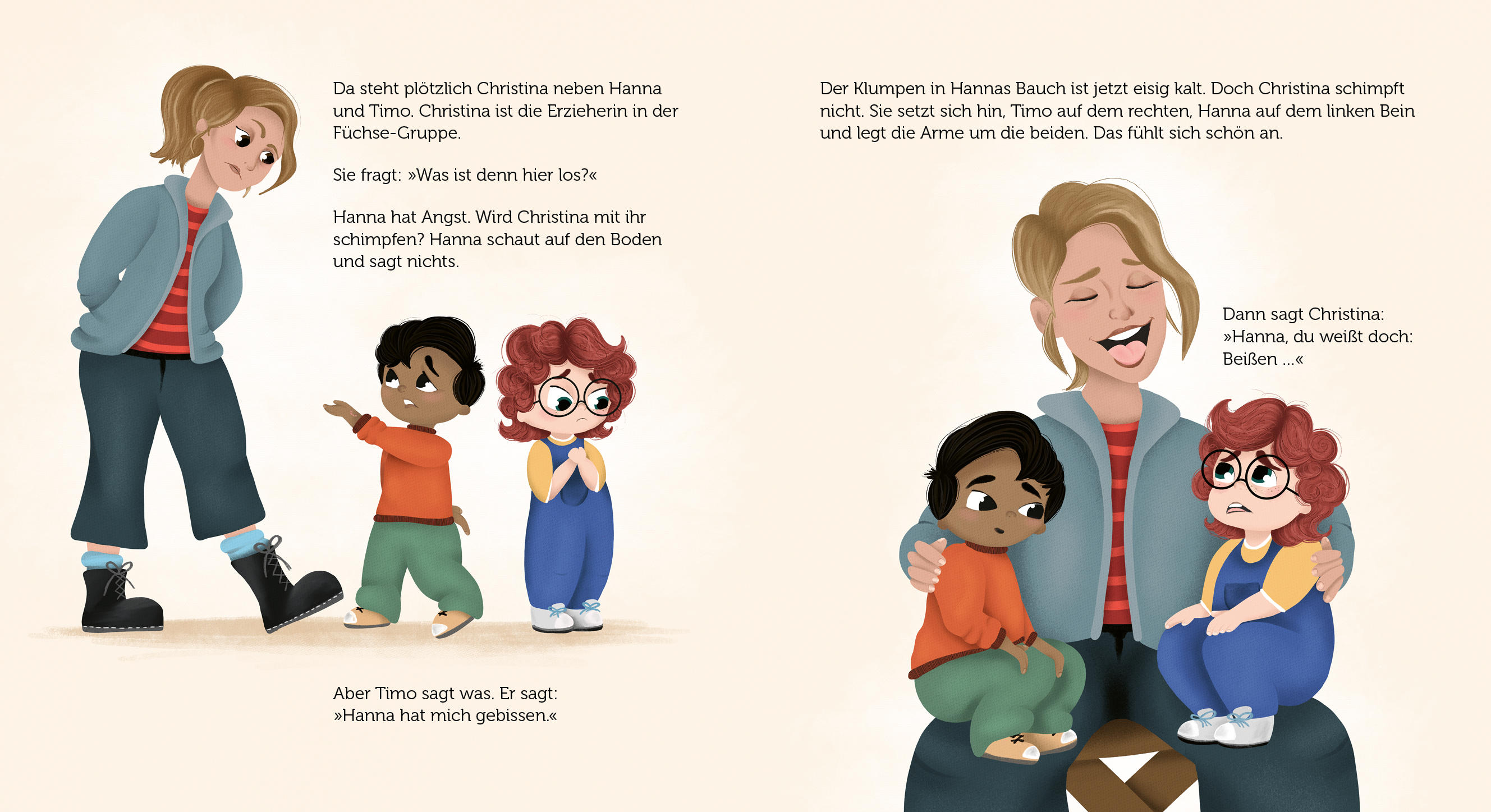 Timo und Hanna sind die besten Freunde. Außer die beiden streiten. Als Timo Hanna ihren Puppenwagen einfach wegnimmt, reicht es ihr. Aus lauter Wut beißt Hanna zu. So fest sie kann, beißt sie Timo in den Arm. Aber ist das okay? Nein! Denn beißen darf nur das K...