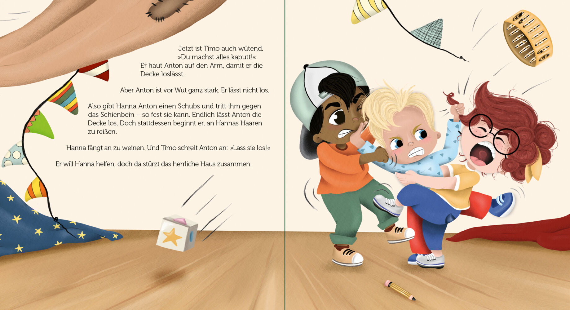 Hanna und Timo spielen gemeinsam Oma und Enkelkind. Sie haben sich ein schönes Spielhaus gebaut und »kochen« leckere Erdbeermarmelade. Dann kommt der kleine Anton und will mitspielen, aber Timo und Hanna wollen lieber allein spielen. Anton fühlt sich ausgesch...