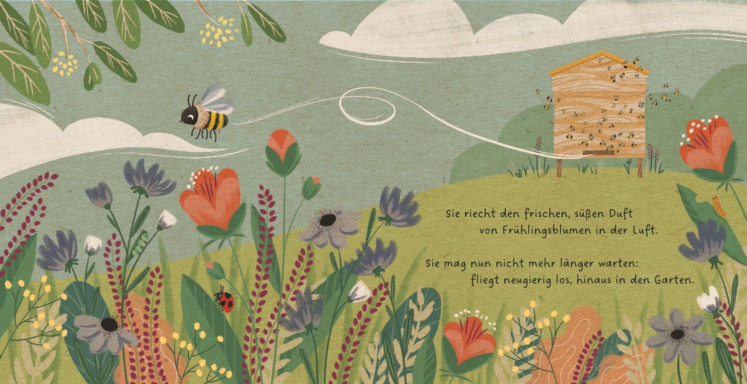 Ein liebevolles Pappbilderbuch Wer summt denn da im Garten? Im schönsten Sonnenschein fliegt die kleine Biene schon im Frühling ganz emsig von Blume zu Blume. Sie sammelt den leckeren Nektar, aus dem sie mit ihren Schwestern den süßen Honig macht. Selbst im H...