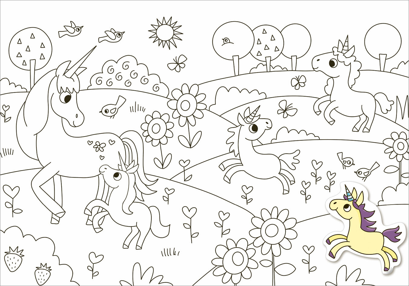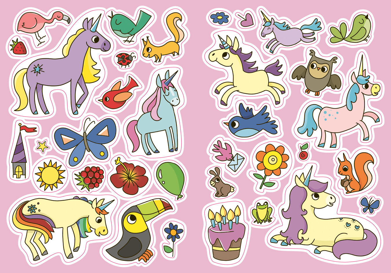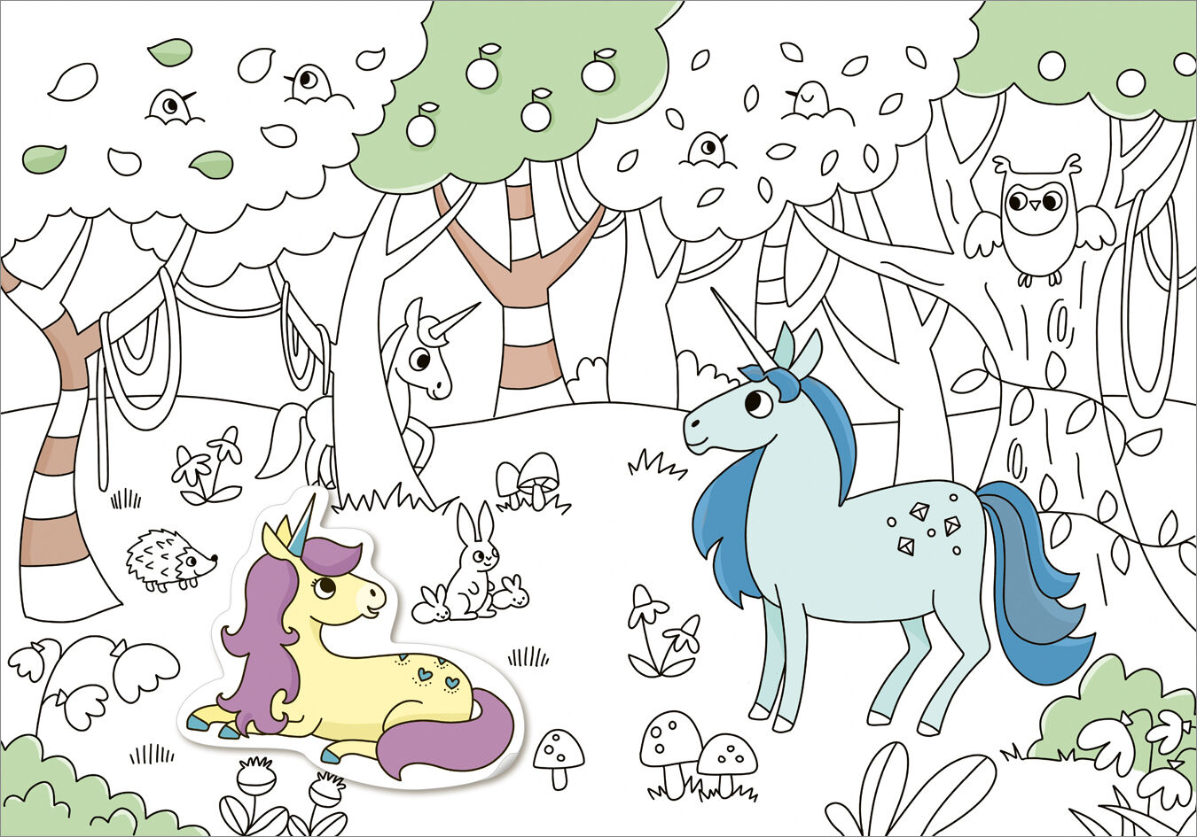 Magisch schöne Motive werden mit Buntstiften und Stickern zum Leben erweckt. Ein Einhorn im Dschungel, umgeben von Papageien und Blumen oder eine Geburtstagsfeier mit vielen Einhörnern und Geschenken können fantasievoll ausgemalt und bestickert werden. In jede...