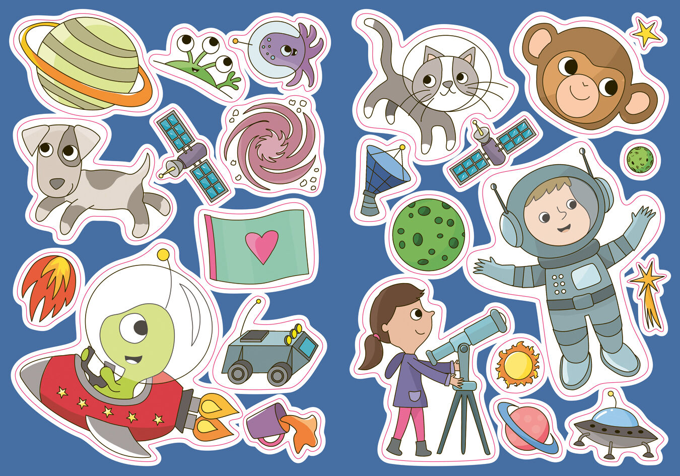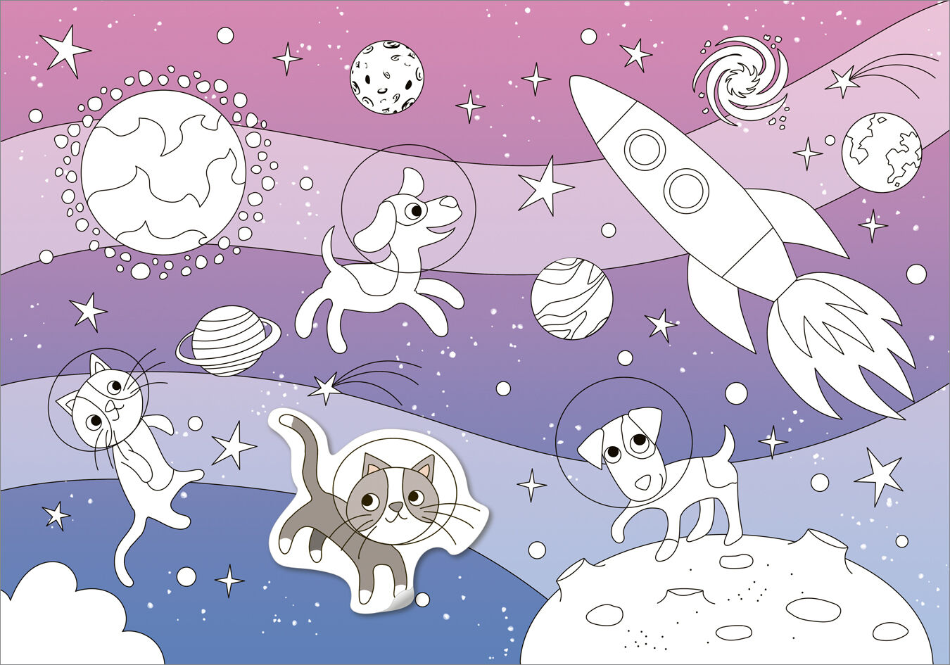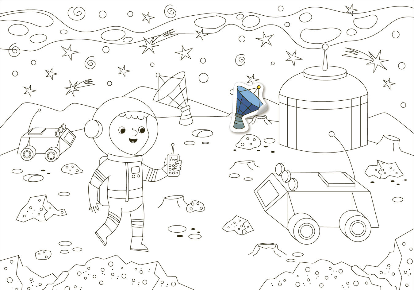 Ab ins All! Der fulminante Raketenstart, ein Flug durch die Weiten des Universums oder kleine Aliens im Ufo können mit Buntstiften und Stickern fantasievoll gestaltet werden. Rund 25 passgenaue Sticker können auf das entsprechende Motiv oder an anderer Stelle ...