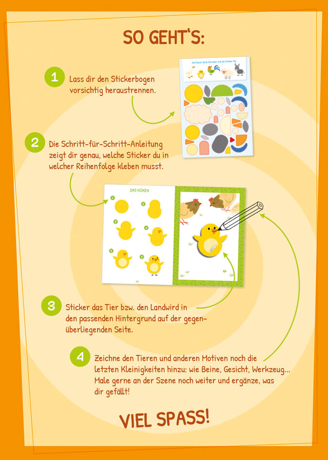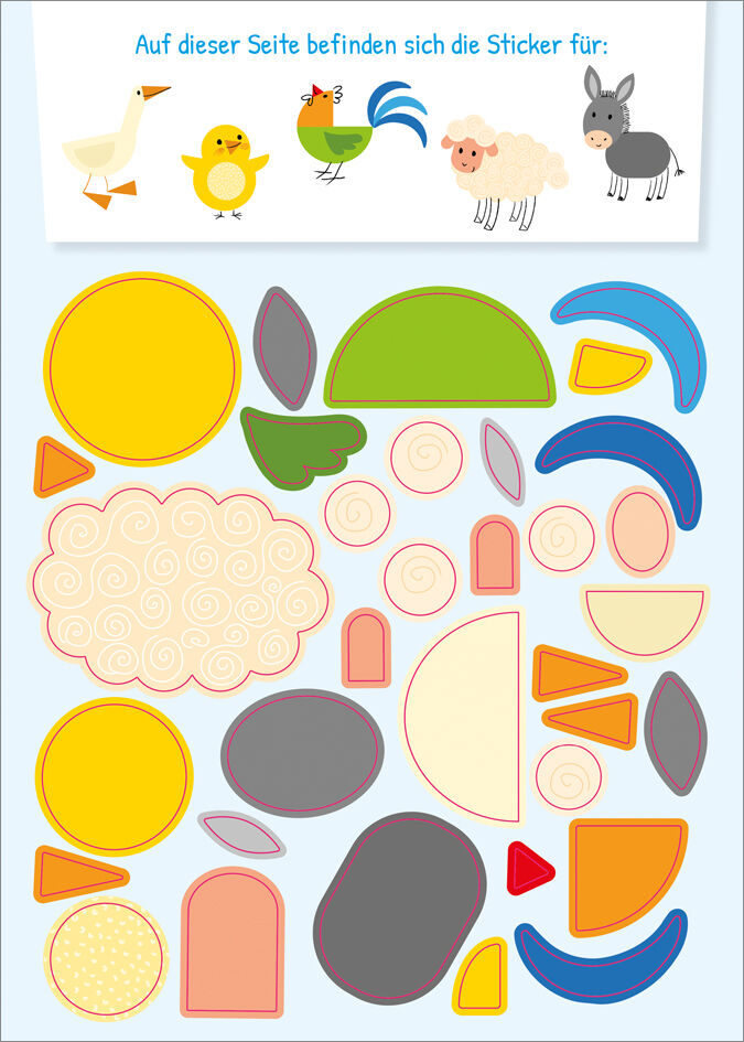Auf der Wiese fehlt doch was? Und auch der Teich ist ziemlich leer! Kein Wunder, denn die Bauernhoftiere müssen erst noch zusammengesetzt werden. Eine kleine Schritt-für Schritt-Anleitung hilft den Kindern, die passenden Sticker zu finden und richtig aneinande...