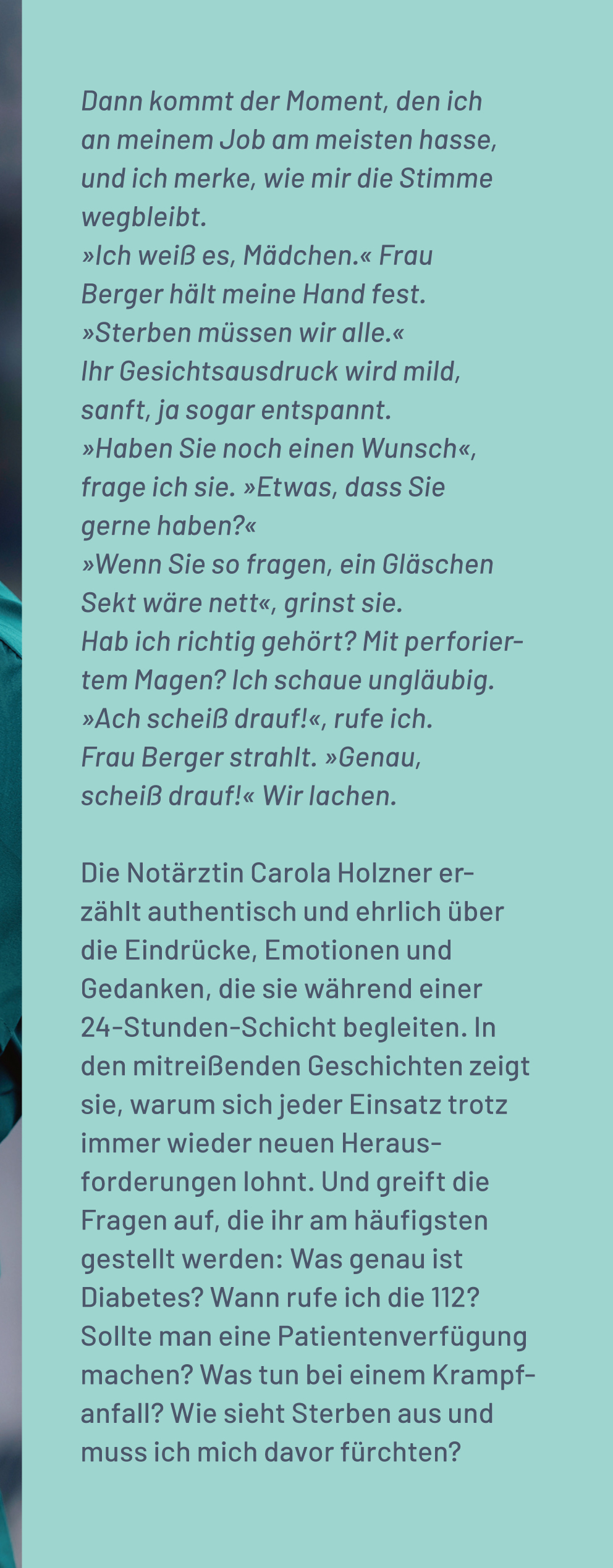 Sekunden entscheiden. Jeder Patient zählt. Carola Holzner ist als Notärztin im Einsatz und arbeitet als Oberärztin in der Notaufnahme. Nirgendwo sonst sind die Grenzen so schmal zwischen Glück und Unglück, Hoffnung und Verzweiflung, Leben und Tod. Sekunden en...