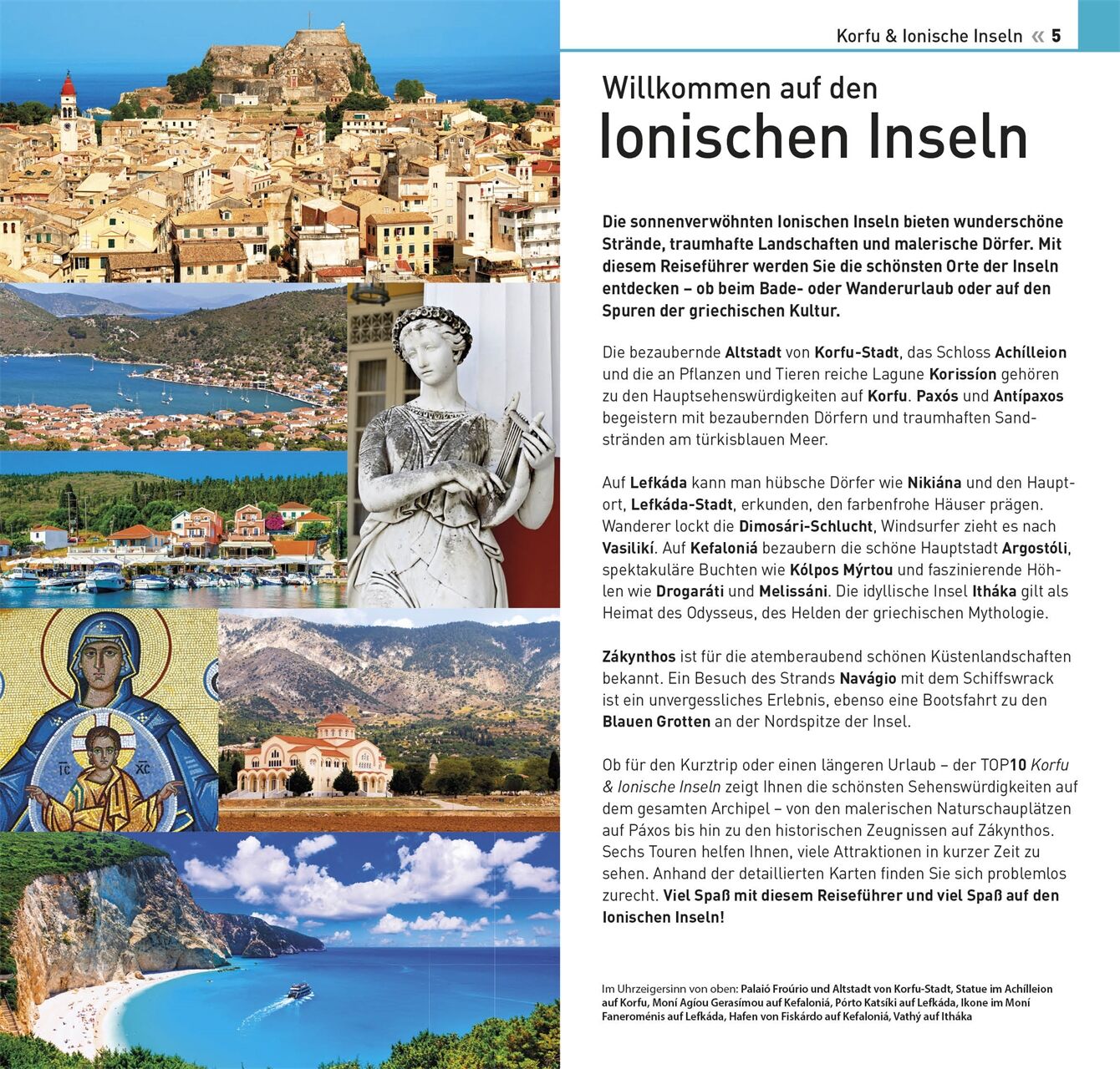 Beobachten Sie die artenreiche Flora und Fauna der Süßwasserlagune Korissíon im Süden von Korfu, wandern Sie zum Wasserfall der Dimosári-Schlucht auf Lefkáda oder staunen Sie über die atemberaubend schönen Küstenlandschaften von Zákynthos im TOP10 Reiseführer werden die Ionischen Hauptinseln Korfu, Paxós, Antípaxos, Lefkáda, Kefaloniá, Itháka und Zákynthos übersichtlich und ausführlich porträtiert. Stimmungsvolle Fotos und detaillierte Karten zeigen berühmte Sehenswürdigkeiten, malerische Landschaften sowie Restaurant-, Shopping- oder Tourenvorschläge auf einen Blick.