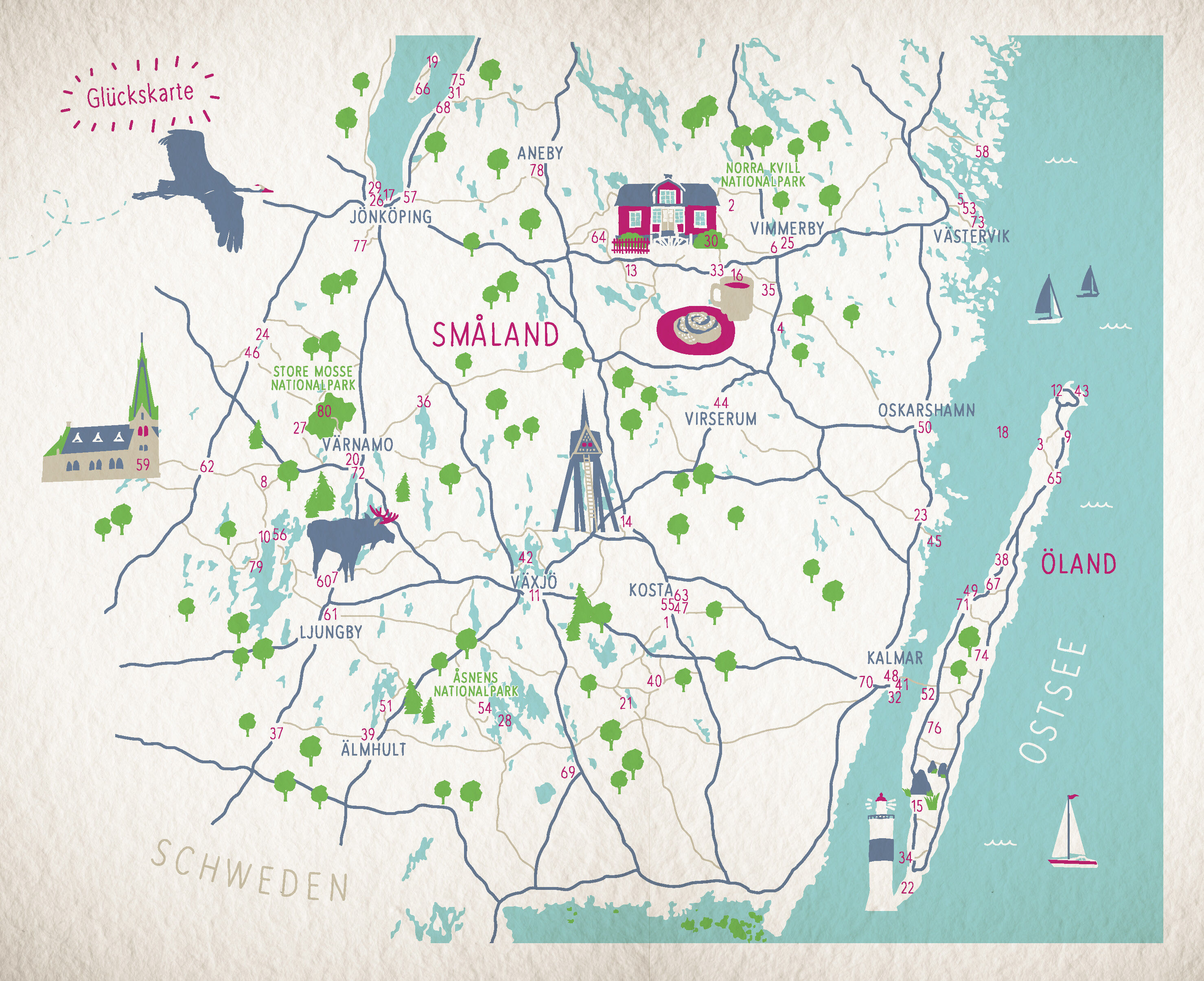 Hej und välkommen in den unendlichen Wäldern Smålands und auf der Sonneninsel Öland! Neben Elchparks und Seen, gemütlichen Cafés und Fischrestaurants wimmelt es von mittelalterlichen Burgen, zeitlosem Design und Glaskunst. Ob auf dem Postboot durch den Schären...