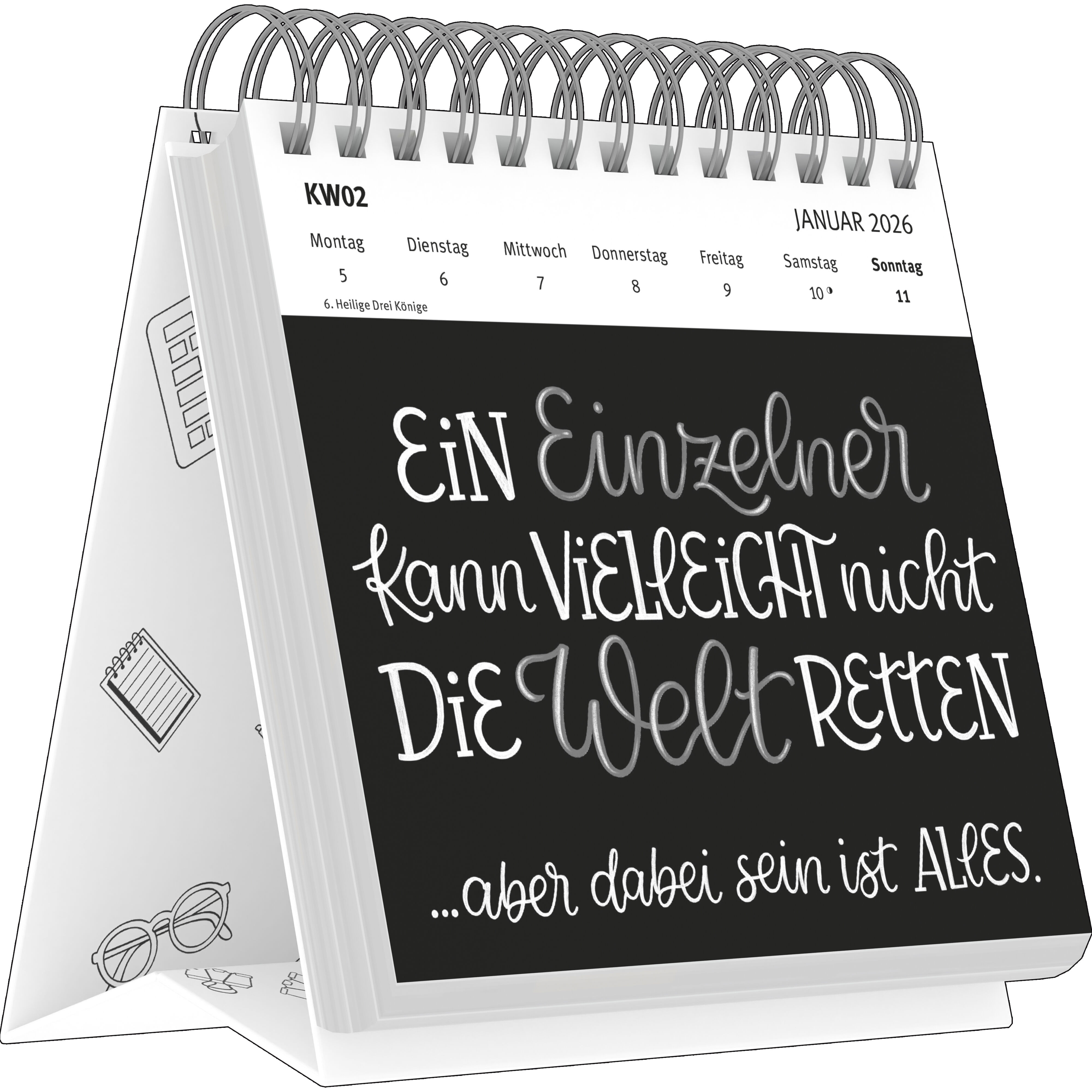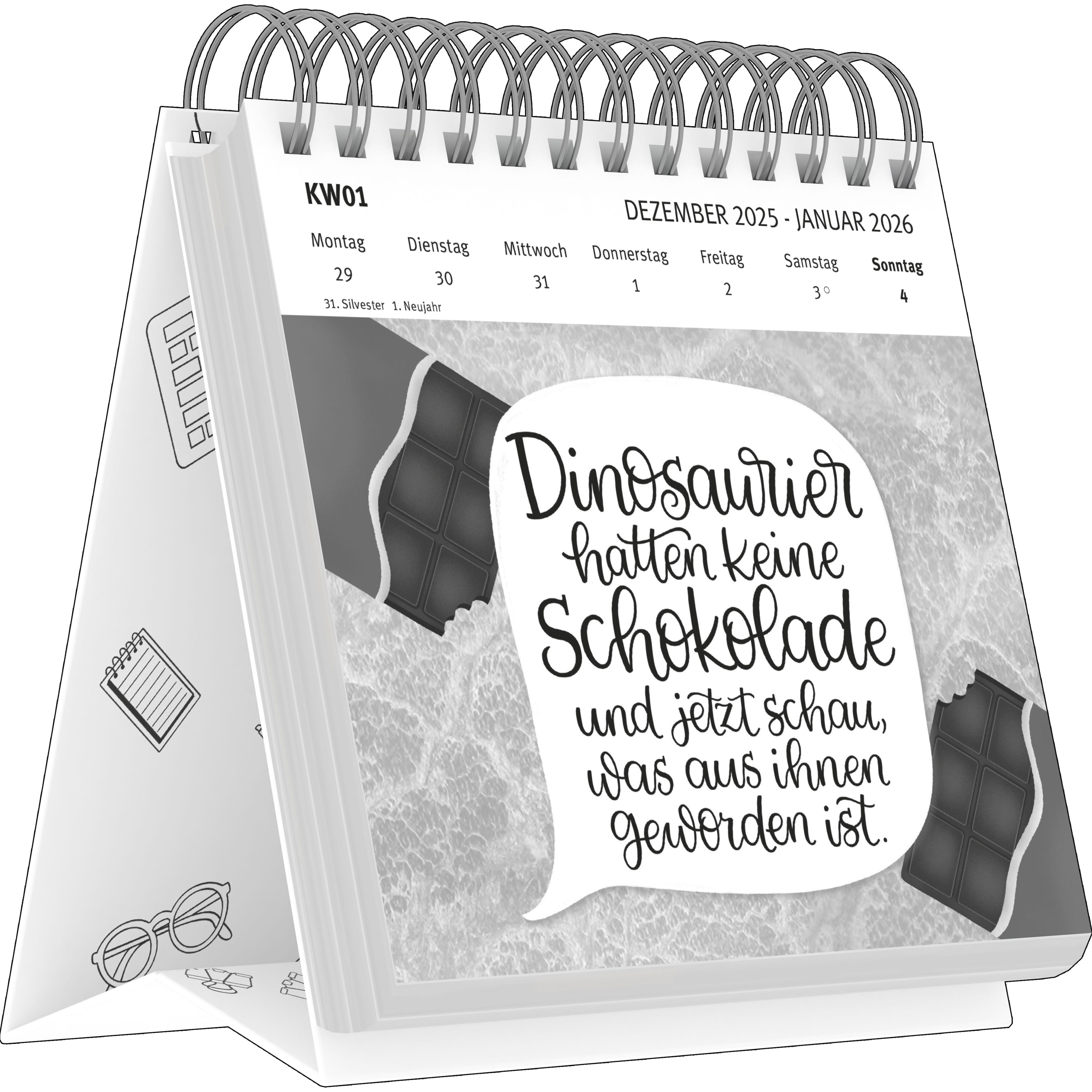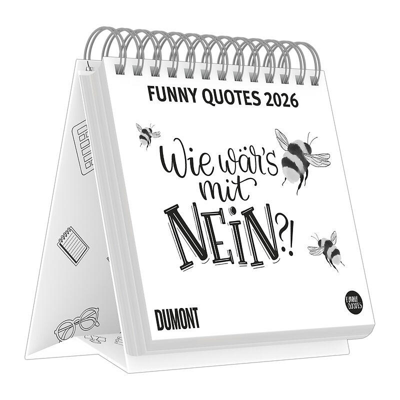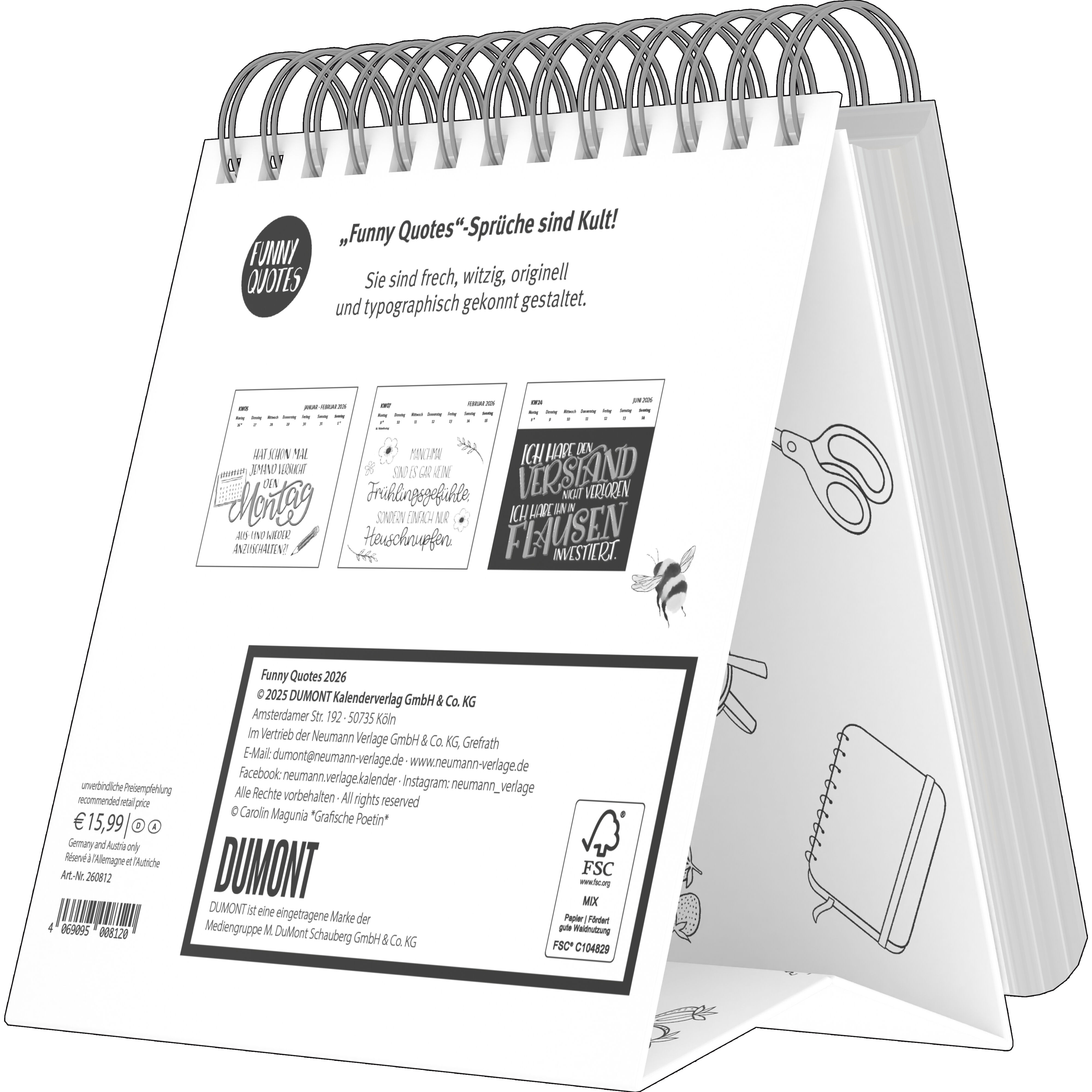 Der DUMONT Tischkalender 2026 Funny Quotes bringt Woche für Woche neue witzige, freche und originelle Sprüche auf den Tisch. Gestaltet in markanter Schwarzweiß-Typografie von der grafischen Poetin Carolin Magunia, ist jedes Kalenderblatt ein echter Hingucker ...